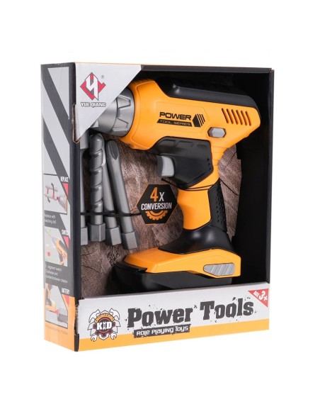 Geltonas elektrinis grąžtas atsuktuvas + 4 keičiami antgaliai + nuimama baterija