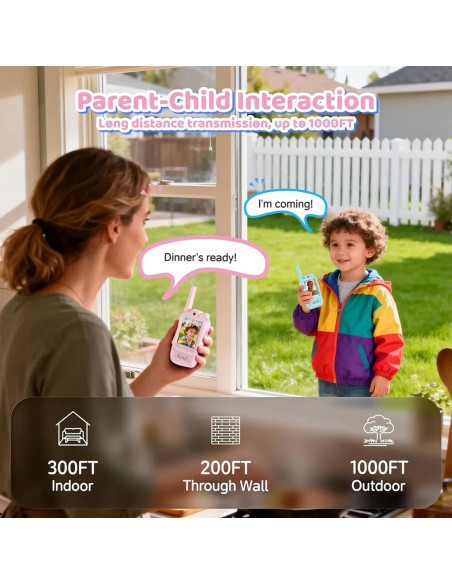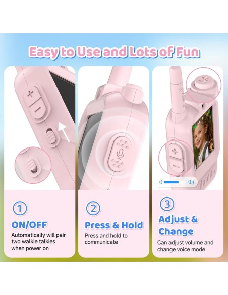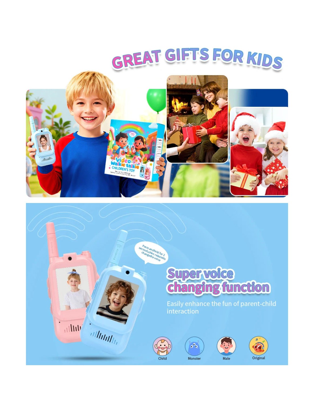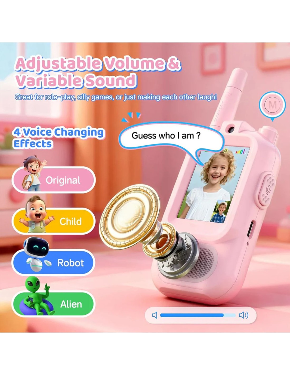 Inovatyvios vaizdo racijos vaikams! Matykite ir girdėkite draugą iki 400 m atstumu. 4 balso režimai, USB-C krovimas ir linksmi filtrai. Puiki dovana 3-12 m. vaikams.