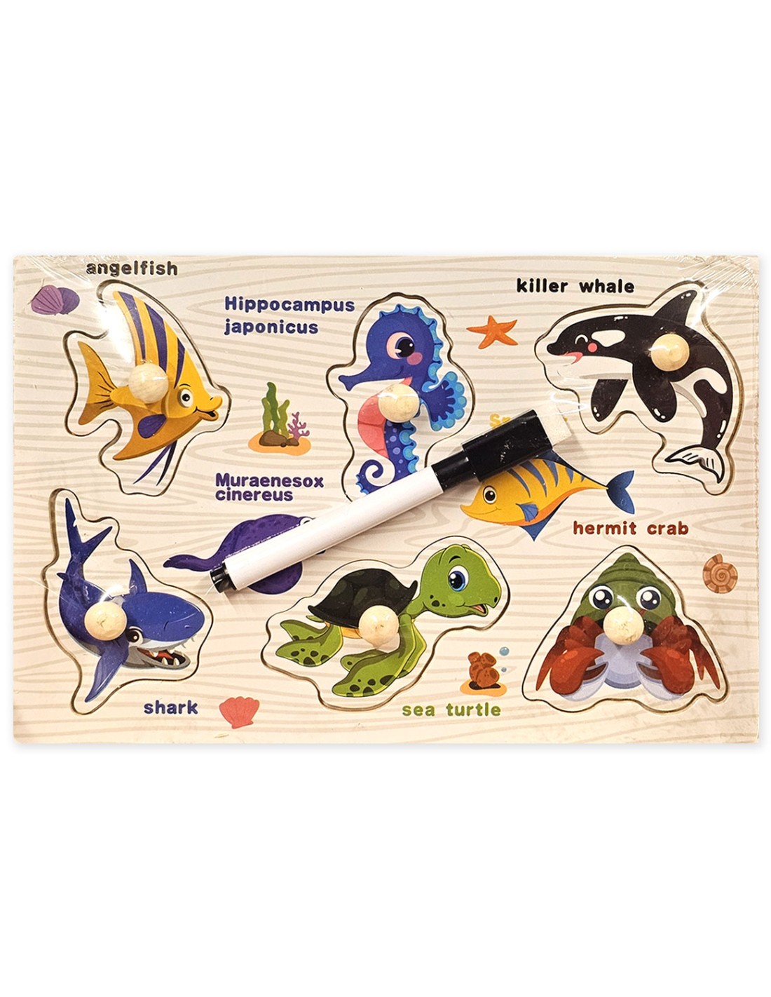Pristatome „2 in 1 Nesudėtingą medinę dėlionę ir piešimo lentą – Jūros pasaulis“ – tai puikus lavinamasis žaislas, idealiai tinkantis smulkiosios motorikos ir kūrybiškumo lavinimui per pažintį su povandeniniu pasauliu! Ši priemonė padeda vaikams lavinti formų atpažinimą ir meninę išraišką.