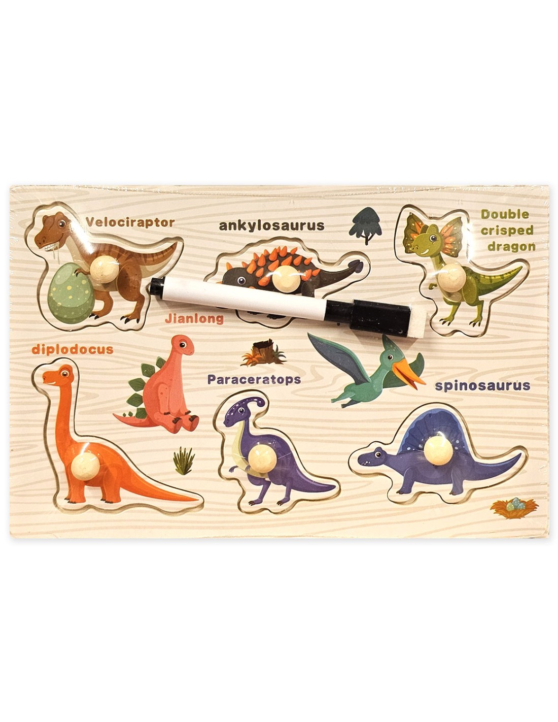 Medinė Dėlionė: Priekinėje pusėje yra medinė gyvūnų dėlionė su 6 detalių. Dėlionė vaizduoja populiarius dinozaurus (pvz., Velociraptor, Diplodocus, Ankylosaurus, Spinosaurus). Ryškios spalvos ir detalės padeda vaikui pažinti šiuos galingus roplius.