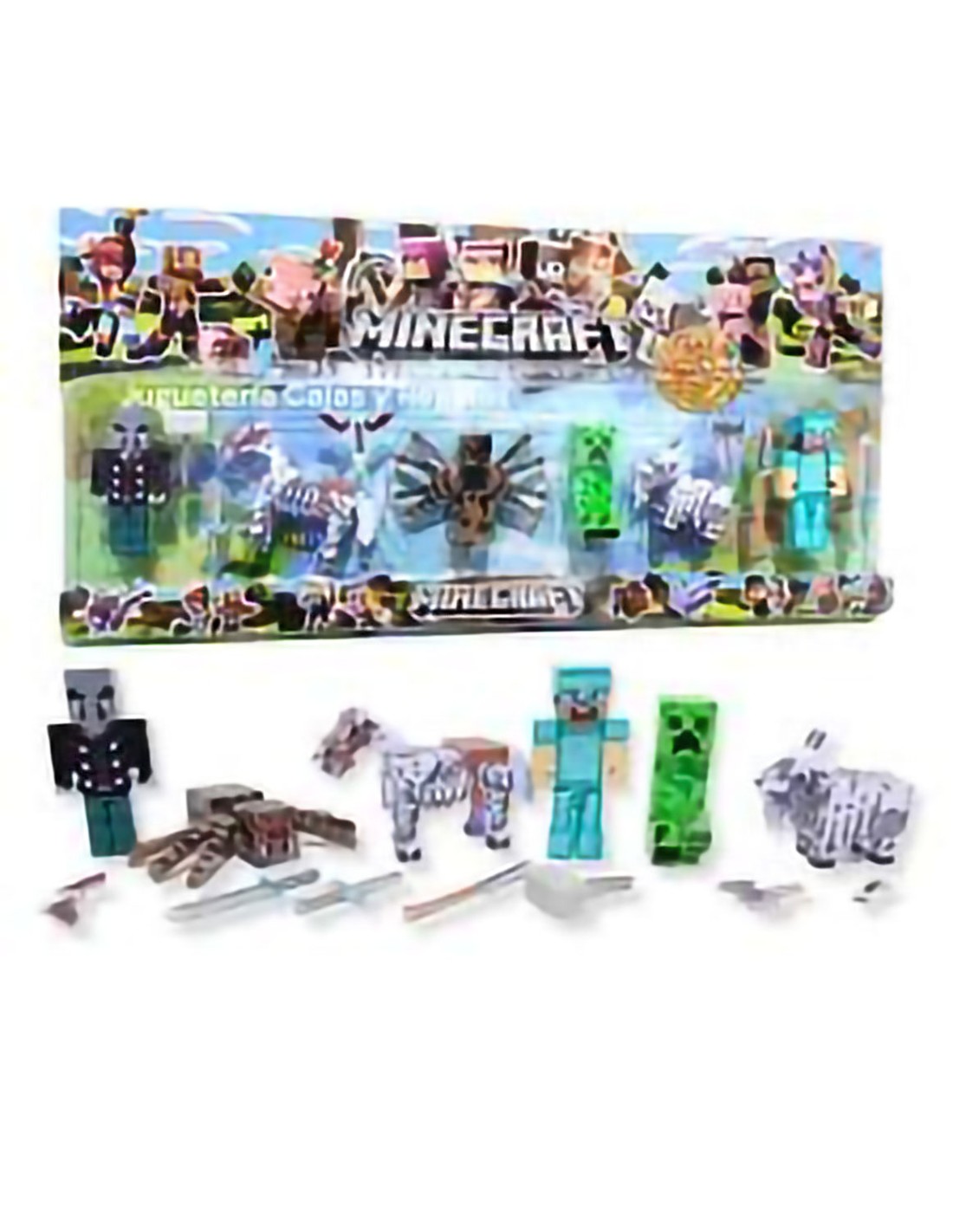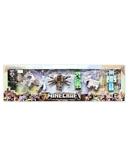 - 6 Minecraft personažai su priedais: rinkinį sudaro įvairūs Minecraft veikėjai, įskaitant populiariausius herojus ir gyvūnus.