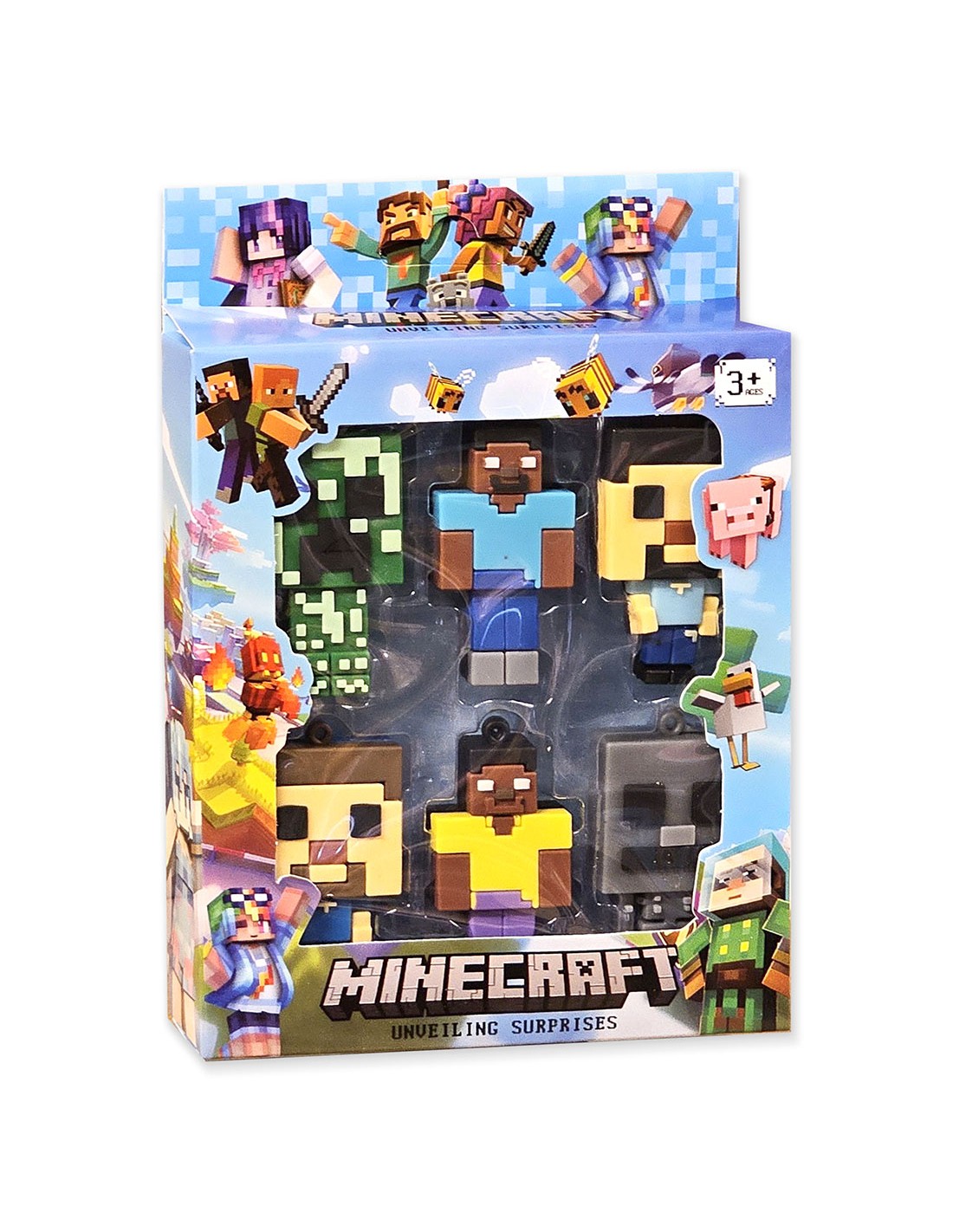Rinkinio Sudėtis: 6 guminės figūrėlės, vaizduojančios „Minecraft“ herojus ir monstrus, supakuotos spalvingoje, originalioje pakuotėje.