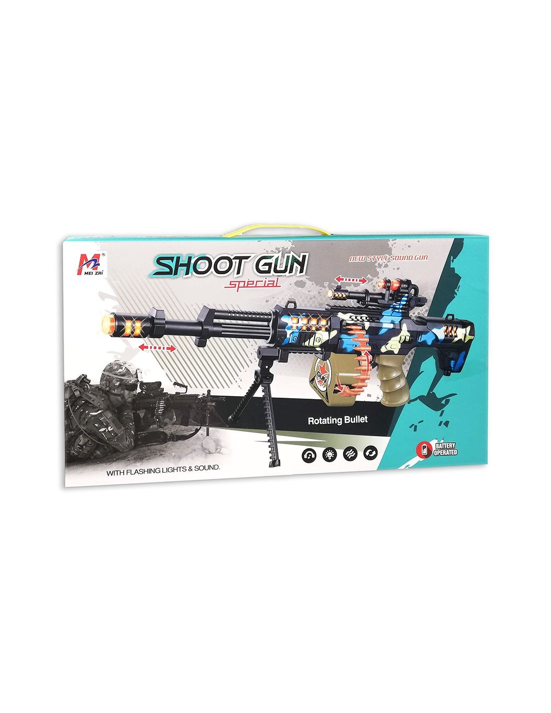 Tikroviškai atrodantis, baterijomis veikiamas automatas leis berniukams žaisti karo žaidimus ir išbandyti savo jėgas aktyviuose žaidimuose. Nuspaudus gaiduką ima šviesti švieselės ir pasigirsta garsas.