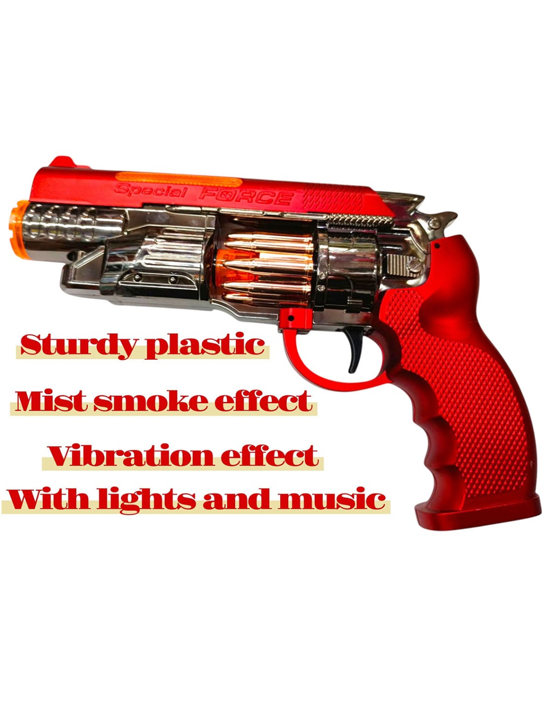 Tikroviški garso efektai, ryškios šviesos ir vibracijos efektai pavers kiekvieną žaidimą dar tikroviškesniu ir įdomesniu. Šis 27 cm ilgio plastikinis šautuvas yra puikus pasirinkimas fantazijos žaidimams ir aktyvioms pramogoms.