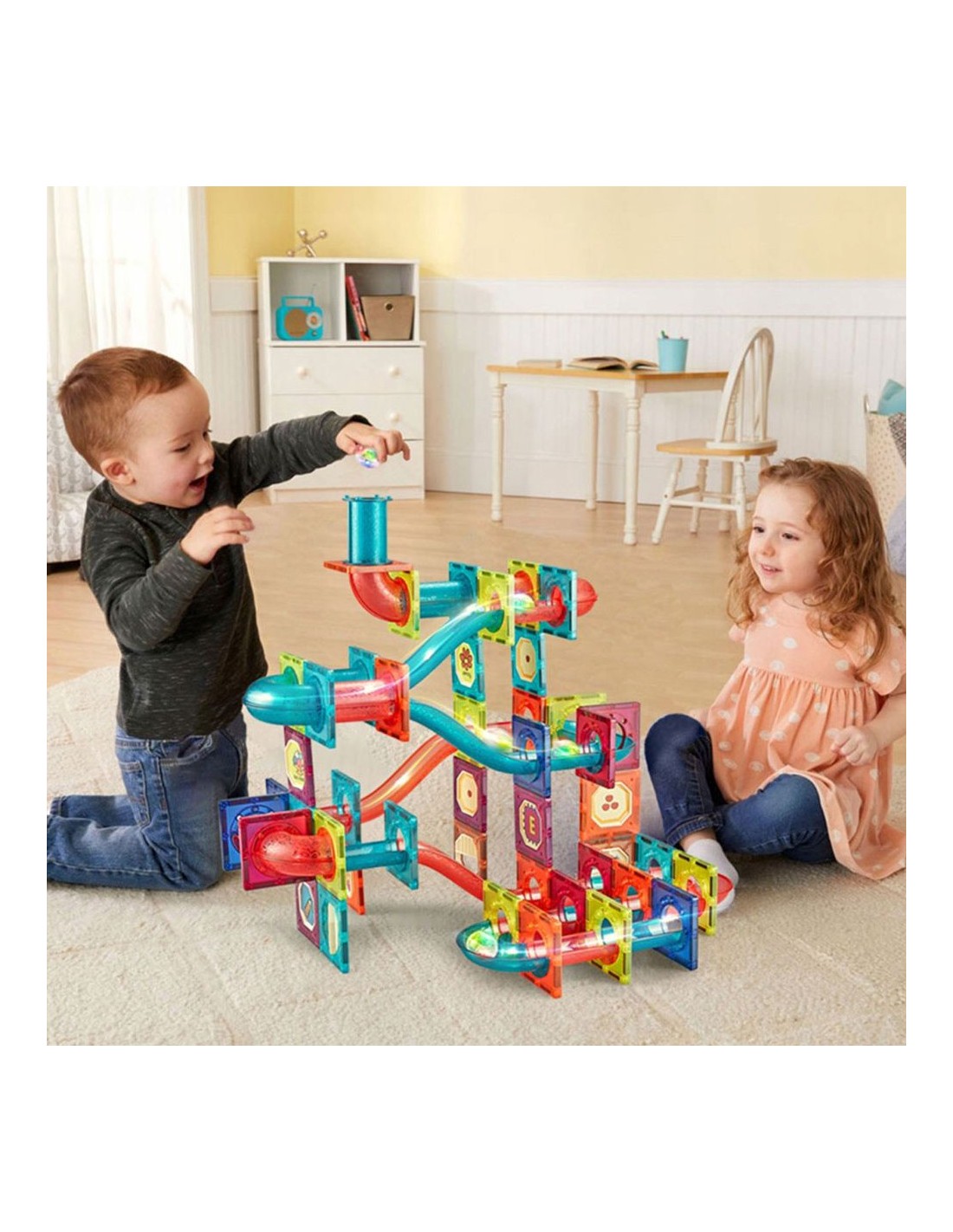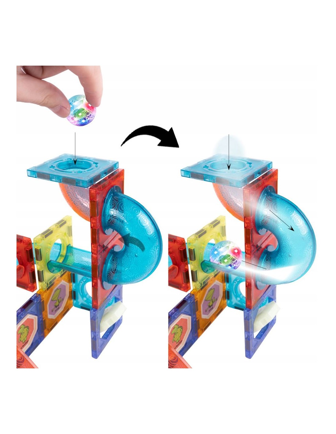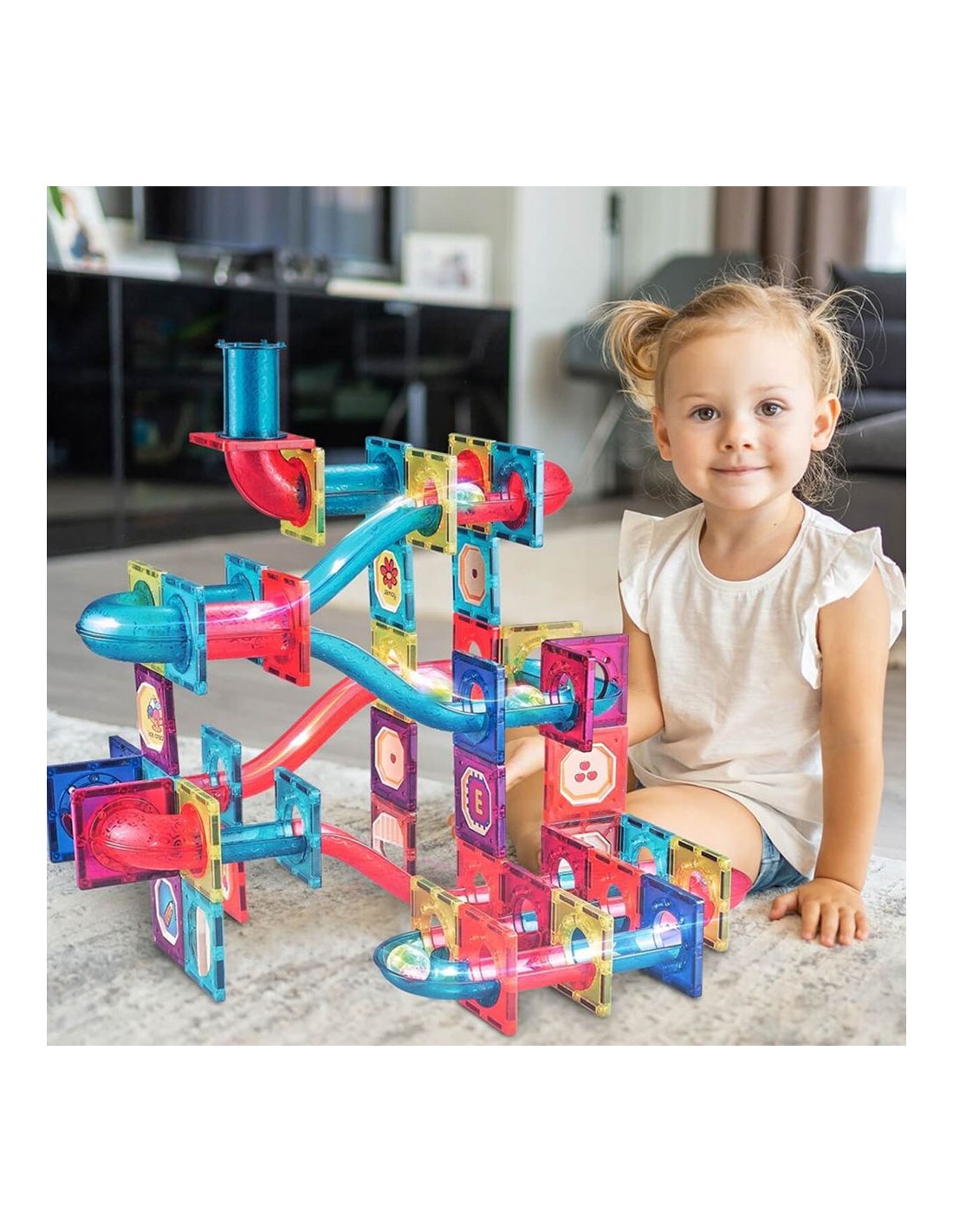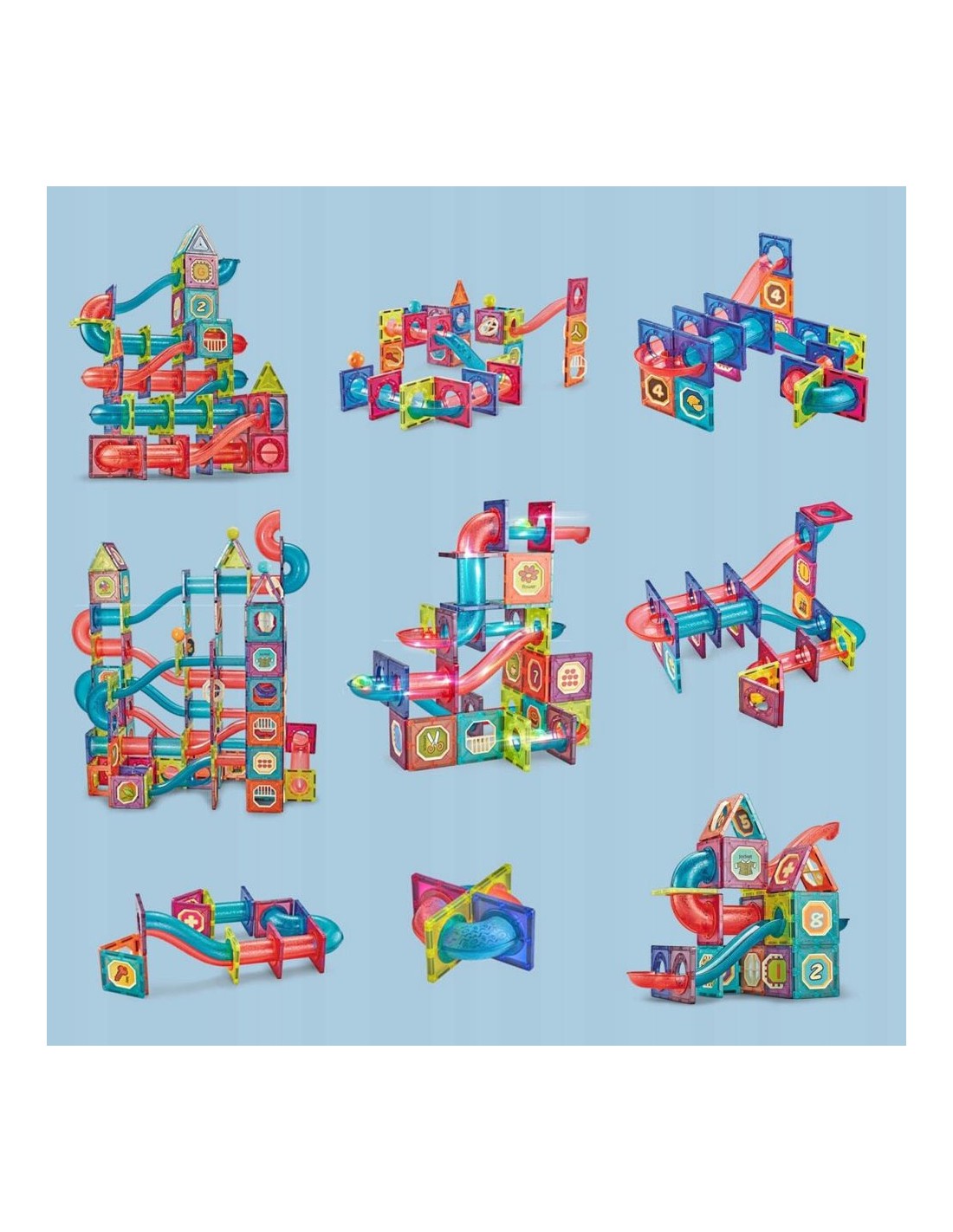2. „Naktinė meno galerija: Šviesos paroda“: Išjunkite kambaryje šviesas ir paprašykite vaiko pastatyti kuo aukštesnį šviečiantį „dangoraižį“. Kai statinys baigtas, kamuoliukų mirksėjimas permatomuose vamzdeliuose sukuria magišką šviesos parodą. Vaikas gali tapti „gidu“ ir papasakoti apie savo statinio architektūrinę idėją.
