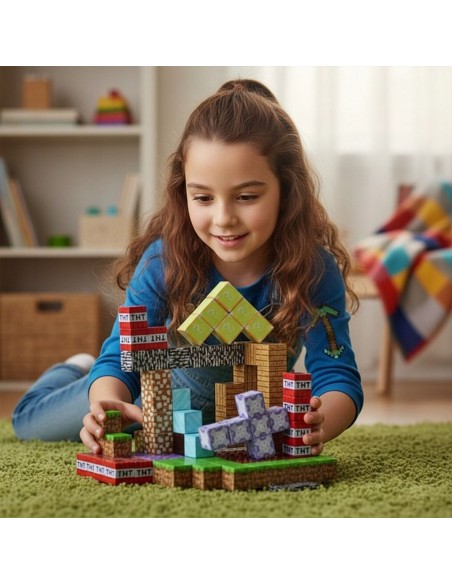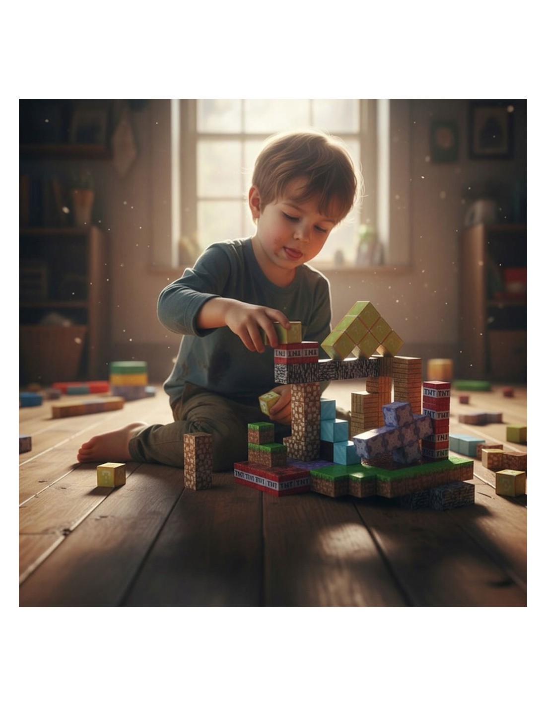 - „Minecraft“ požemių tyrinėtojai su šviesa: Statome sudėtingus požemių labirintus ar kasyklas, naudodami magnetinius blokelius. Įterpiame LED šviečiančius blokelius, kad sukurtume tikrovišką kasyklos ar požemio atmosferą. Figūrėlės tampa drąsiais tyrinėtojais, o mes kartu su vaikais ieškome „paslėptų lobių“ (galime paslėpti smulkius žaisliukus ar saldainius). Tai lavina erdvinį mąstymą ir problemų sprendimo įgūdžius.