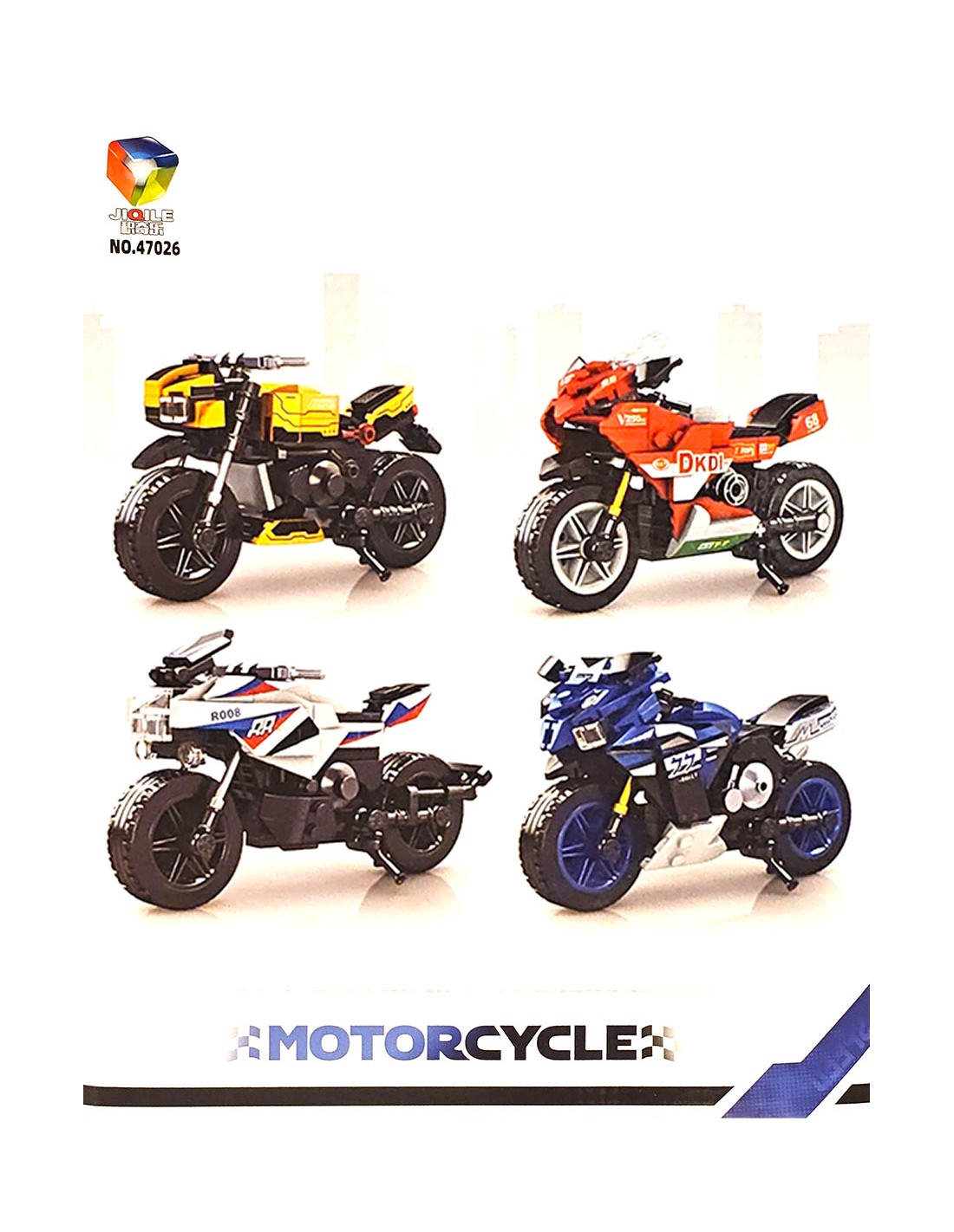 Detalus „Jiqile Motorcycle“ konstruktorius (NO.47026). Iki 233 dalių, 4 skirtingi modeliai. Visiškai suderinamas su Lego. Puiki dovana vaikams nuo 6 metų!