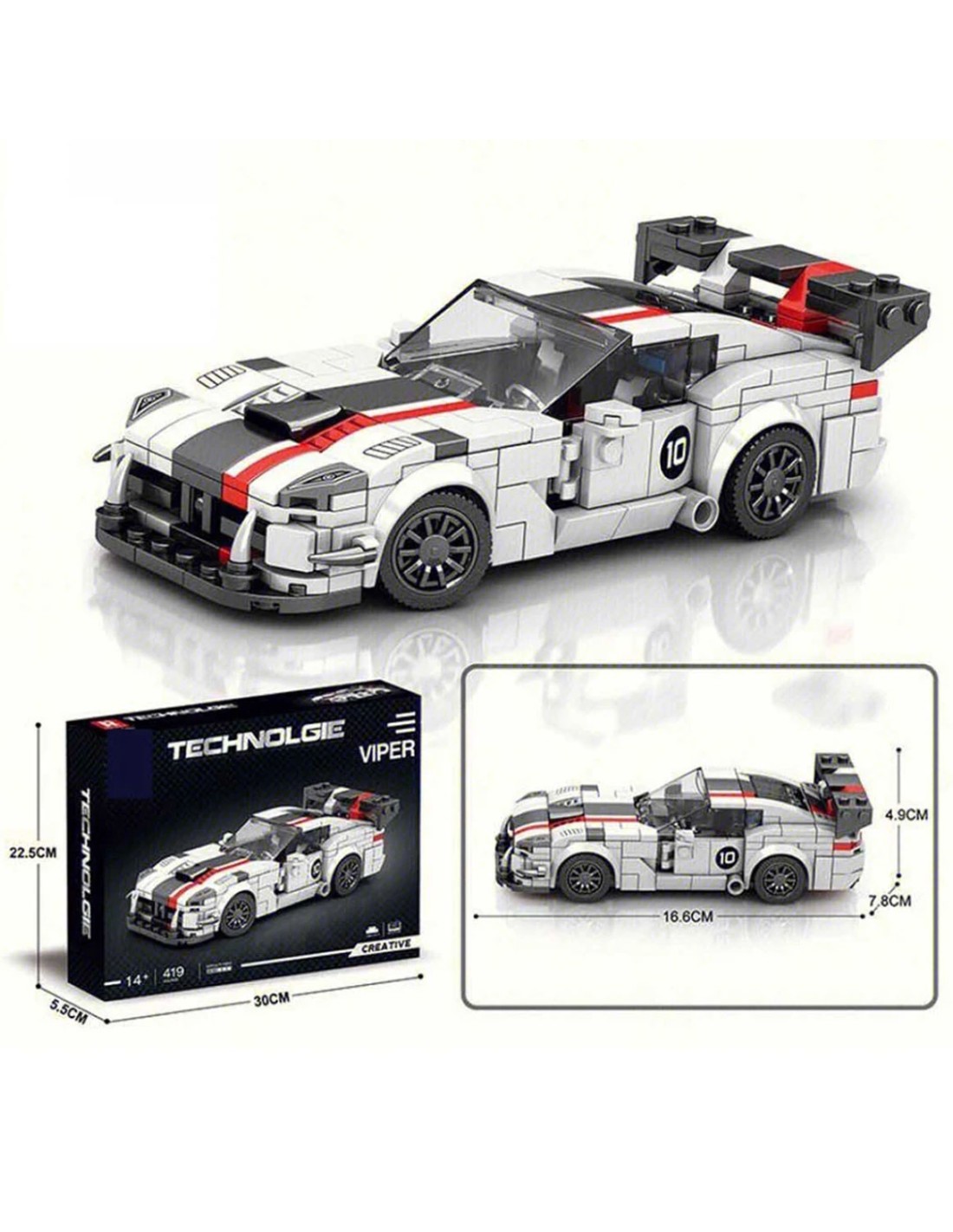 Sukonstruokite baltą „Viper“ sportinį automobilį! 419 detalių, atidaromos durys ir detalus dizainas. Suderinamas su Lego. Tobula dovana entuziastams nuo 14 metų.