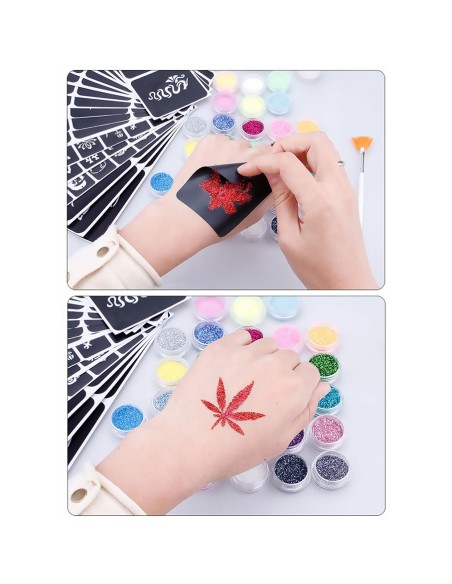 - 24 skirtingų spalvų blizgučius, suteikiančius tatuiruotėms ypatingo žvilgesio.
