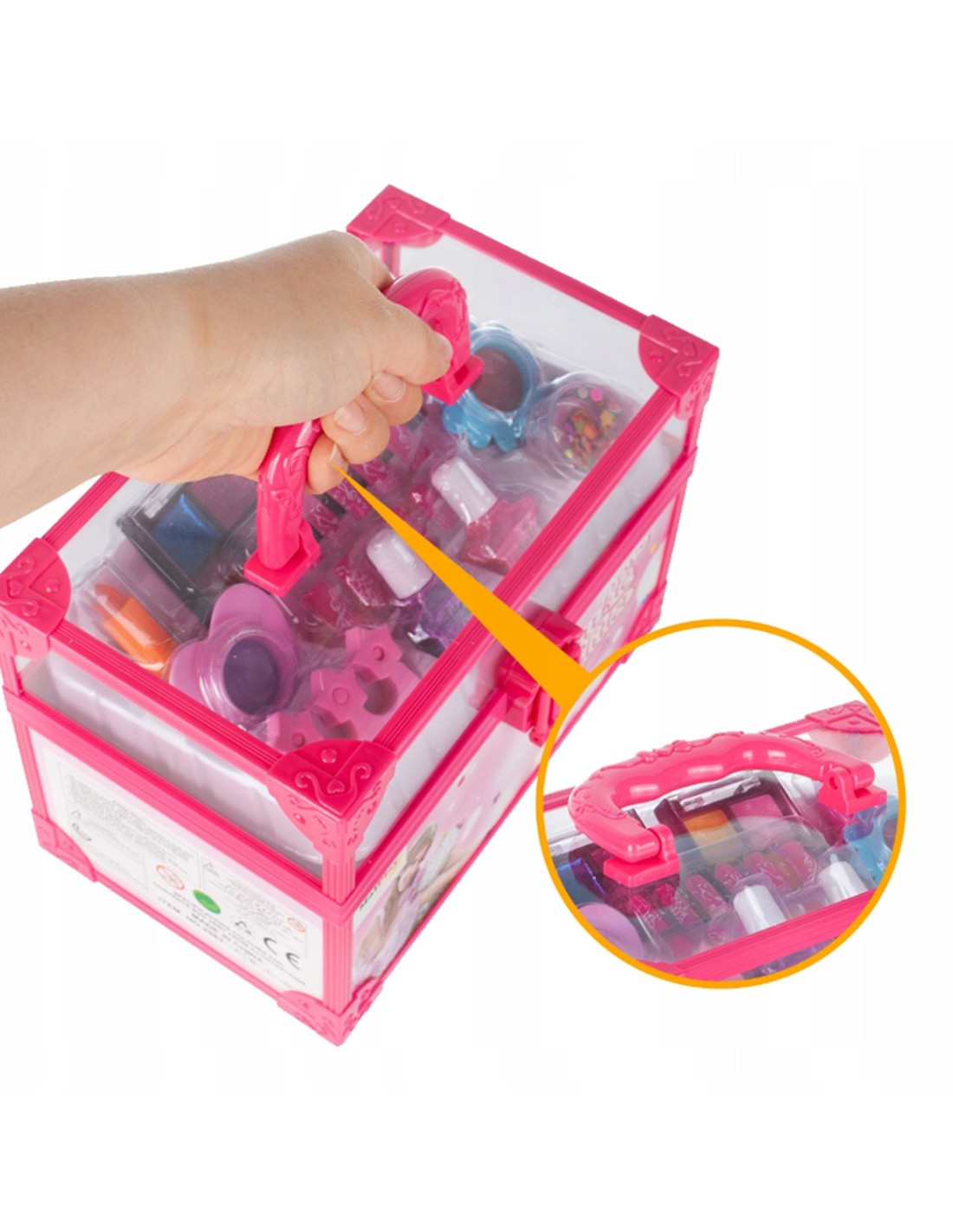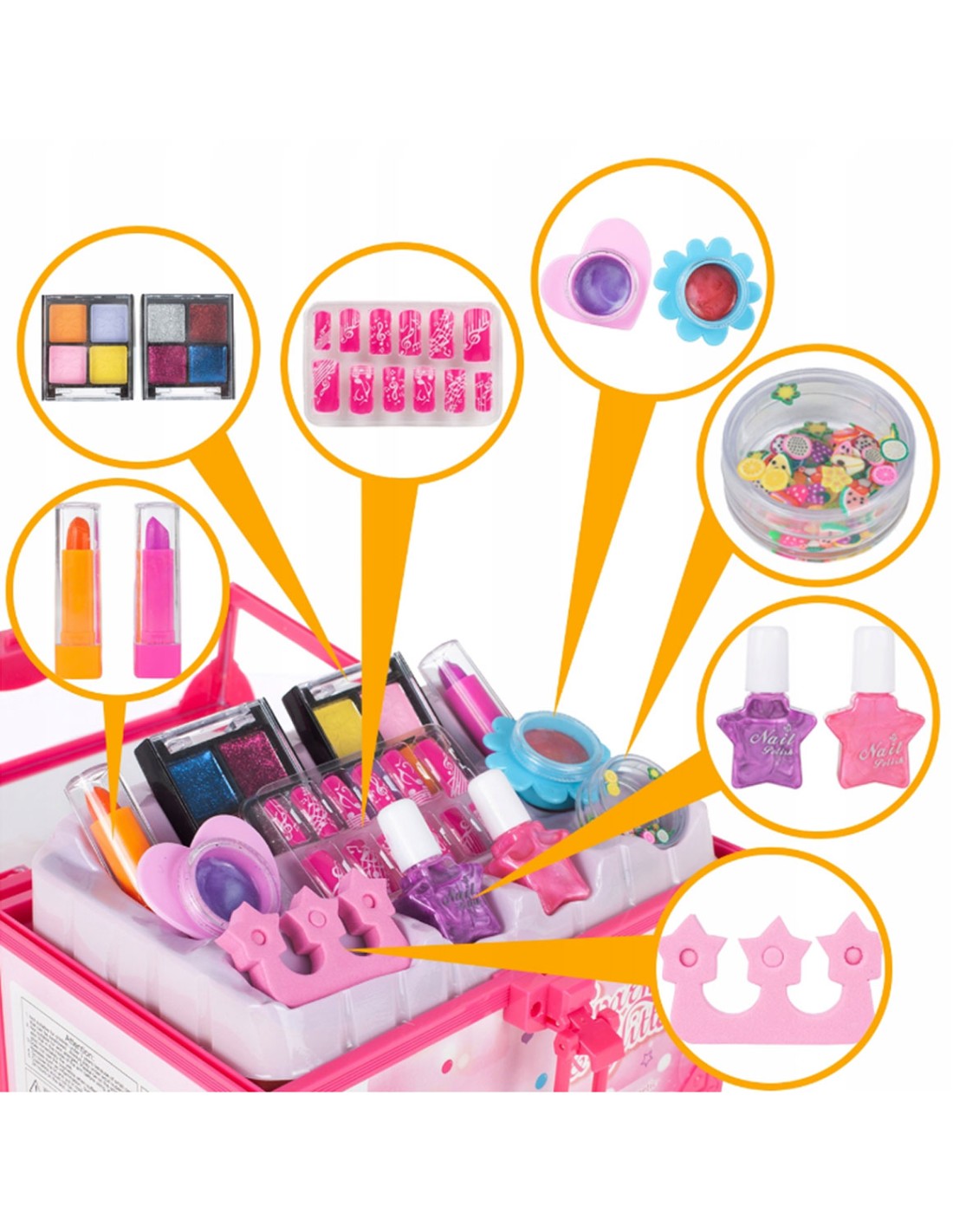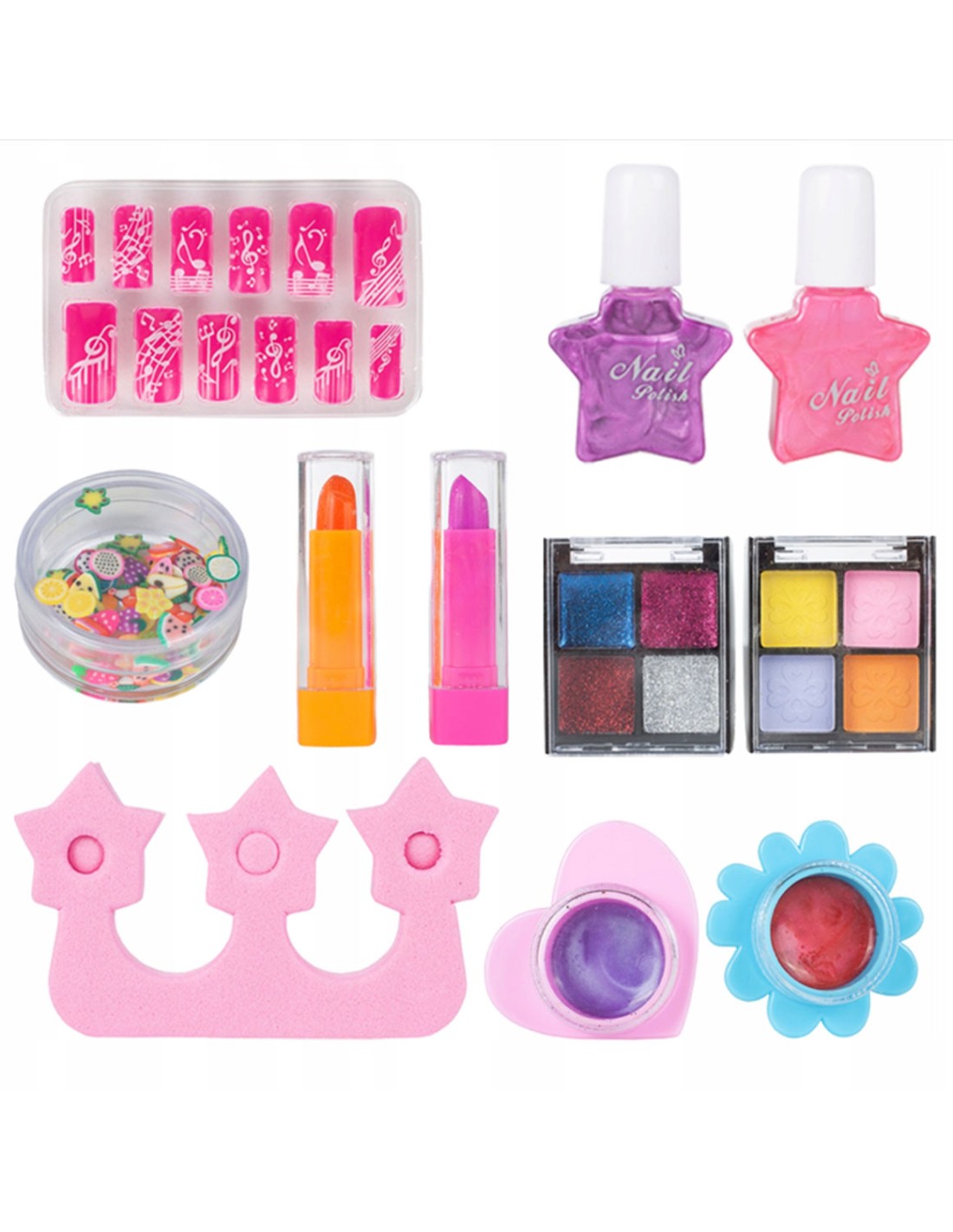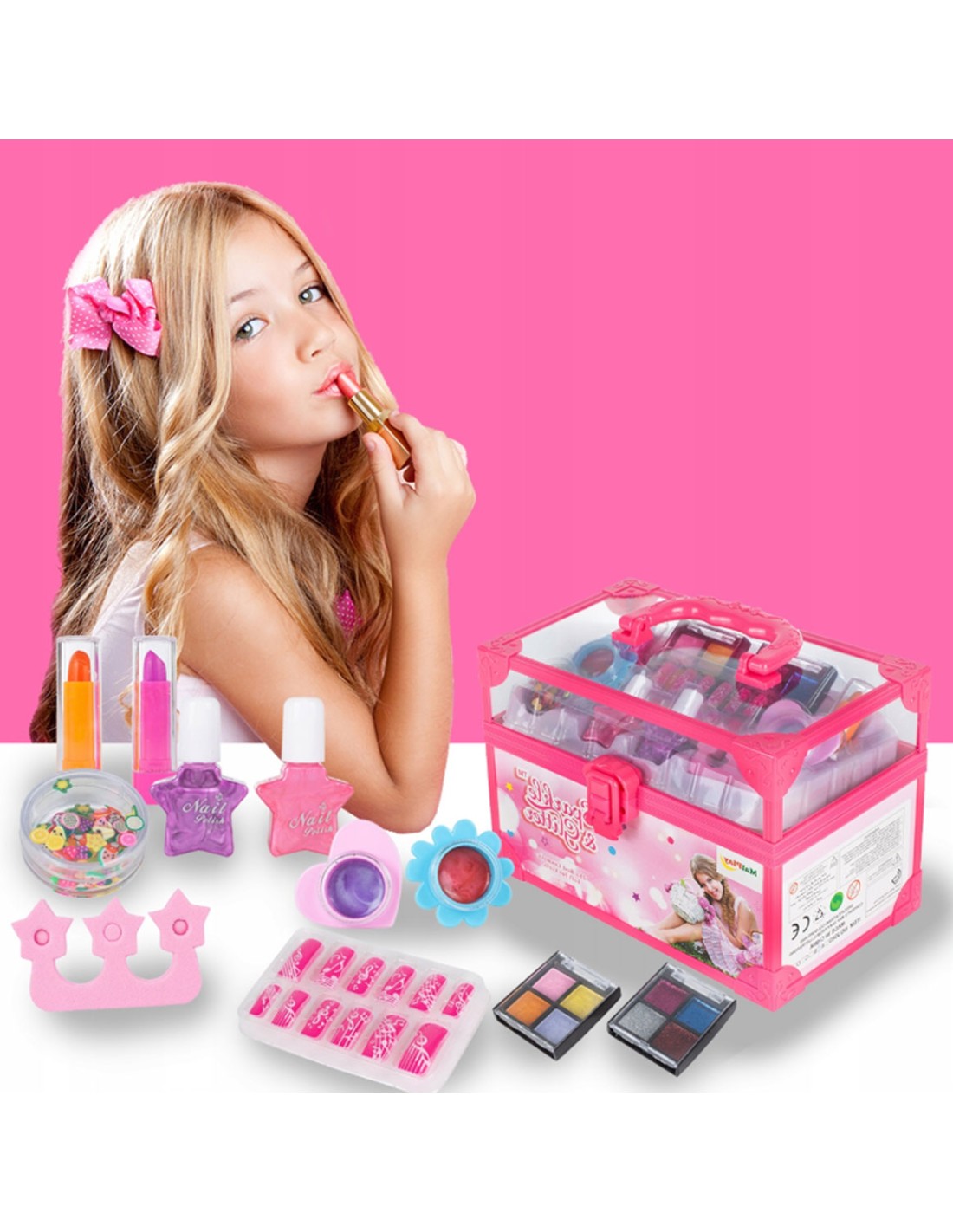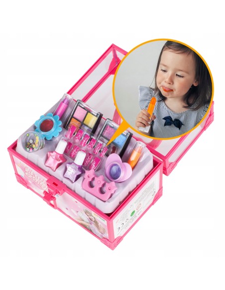 Saugus nagų ir makiažo rinkinis stilingame dėkle! Nuplaunama kosmetika, 2 nagų lakai, lūpų dažai ir šešėliai. Puiki dovana mažosioms princesėms nuo 3 m.