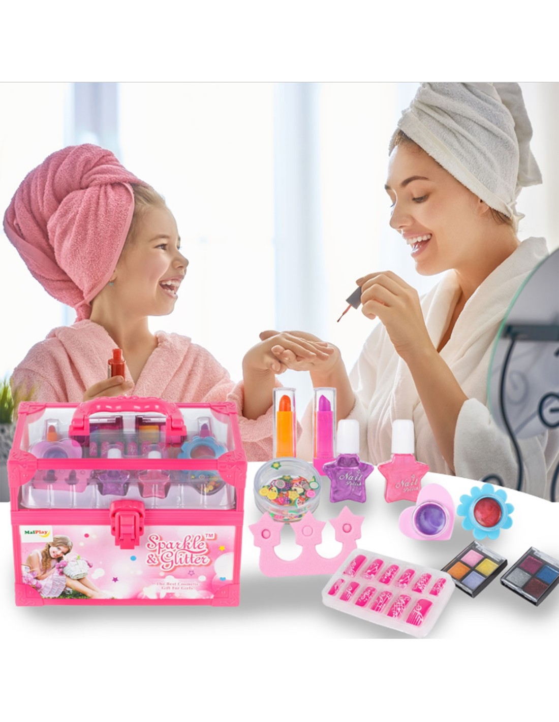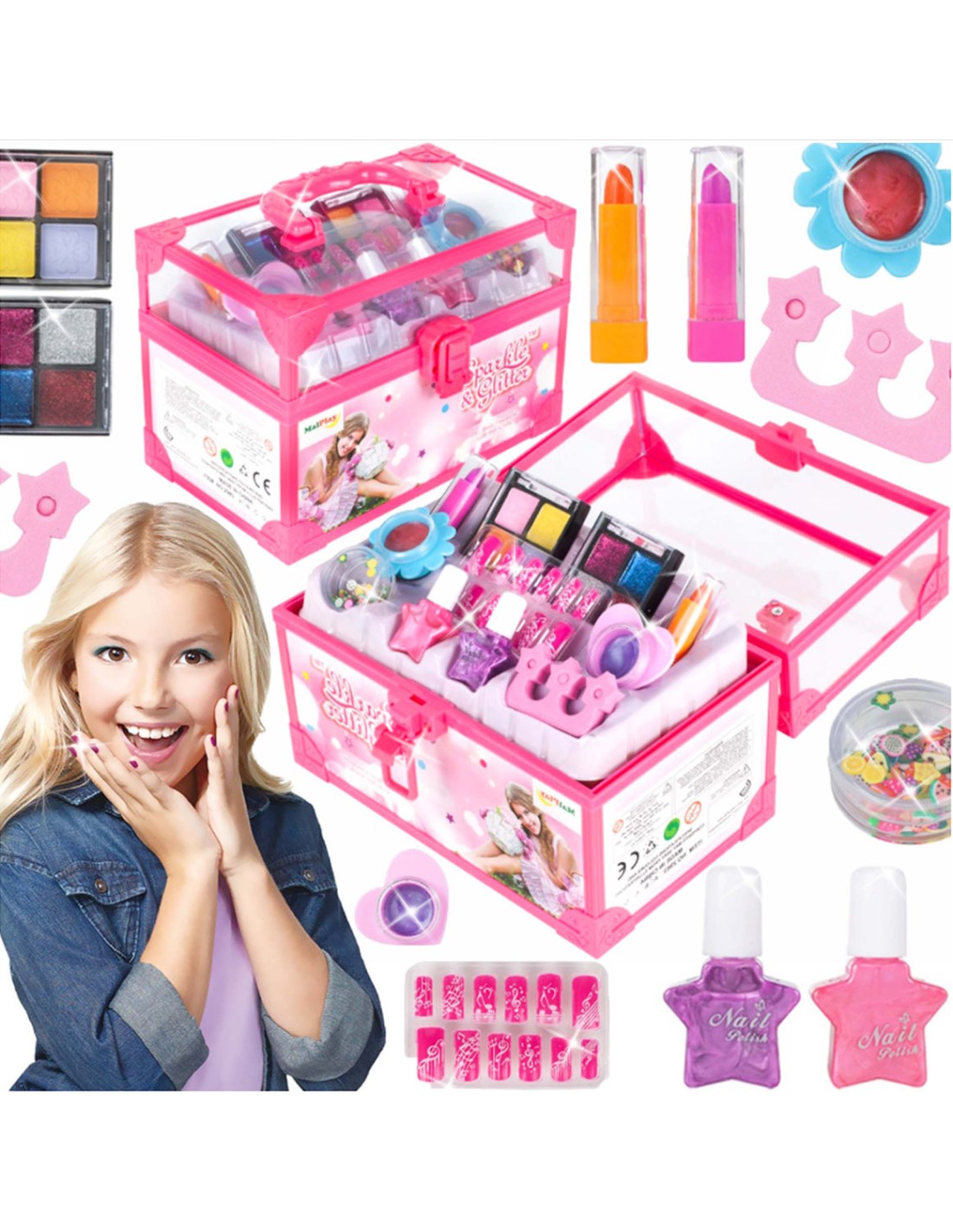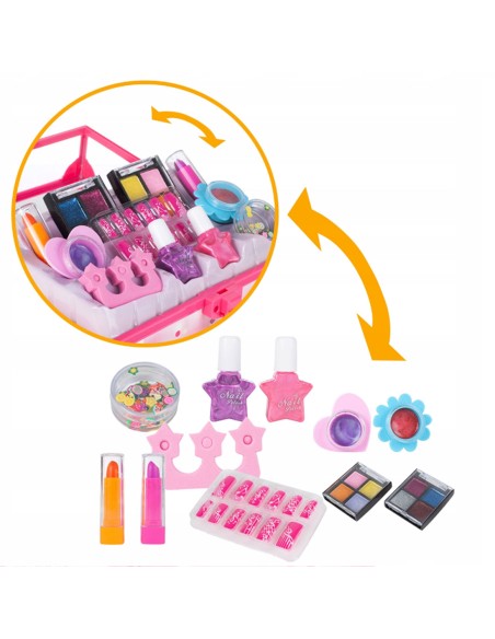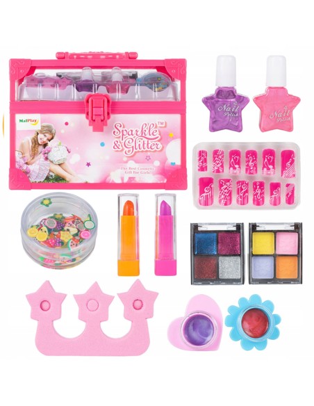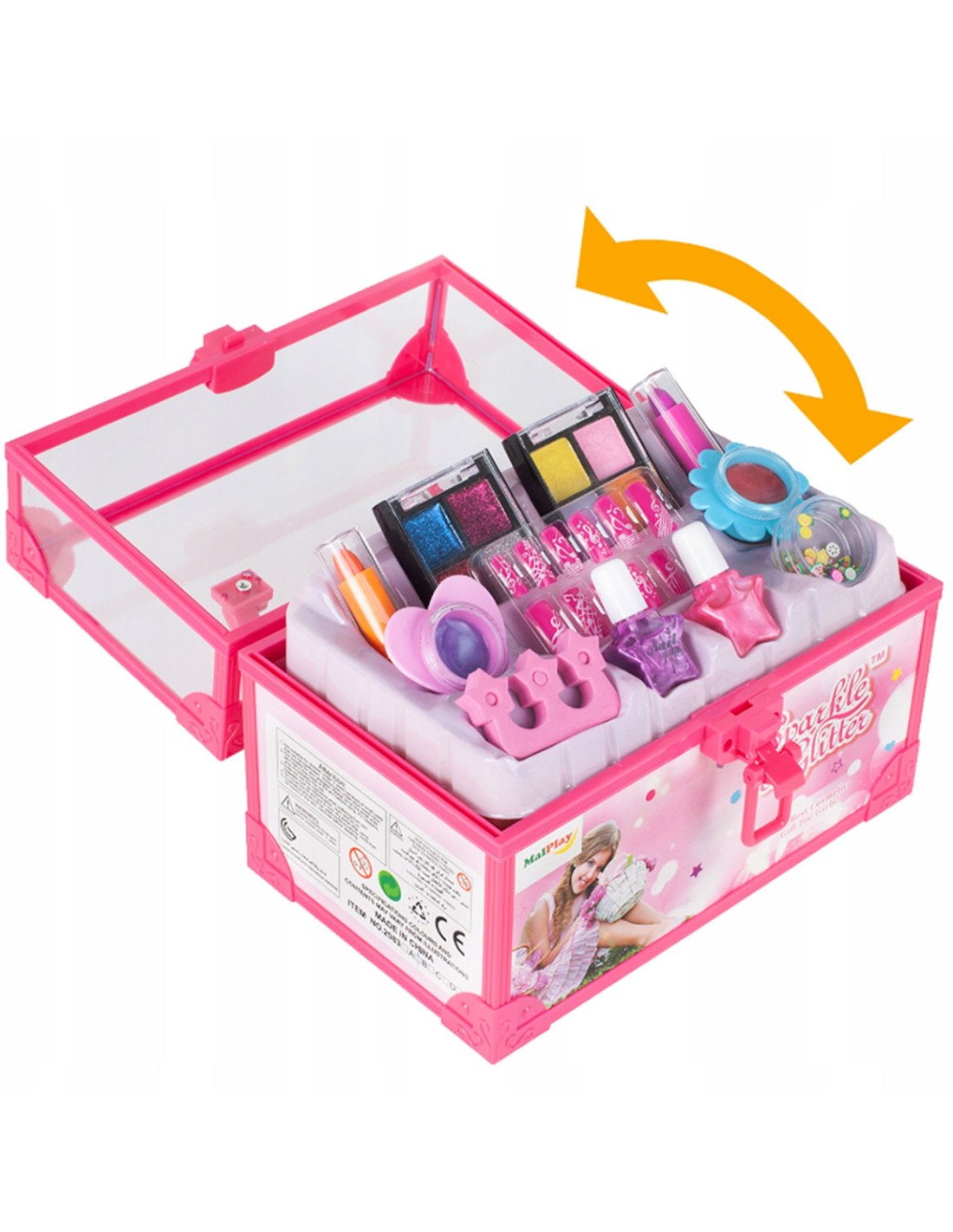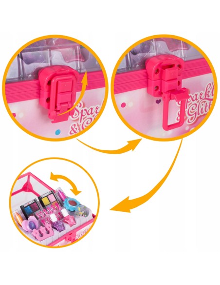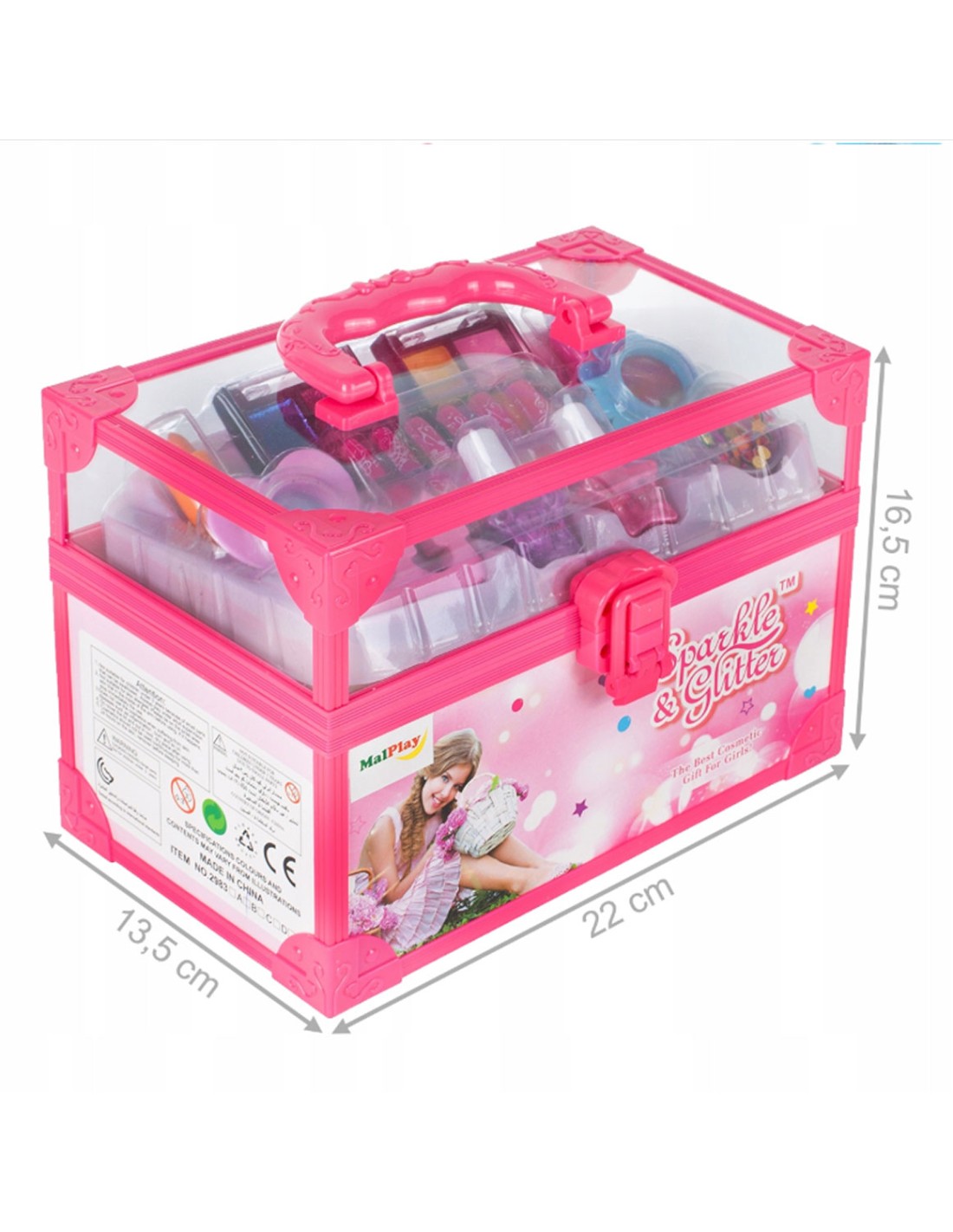 Saugus nagų ir makiažo rinkinis stilingame dėkle! Nuplaunama kosmetika, 2 nagų lakai, lūpų dažai ir šešėliai. Puiki dovana mažosioms princesėms nuo 3 m.