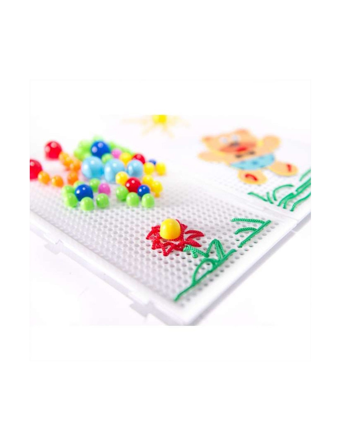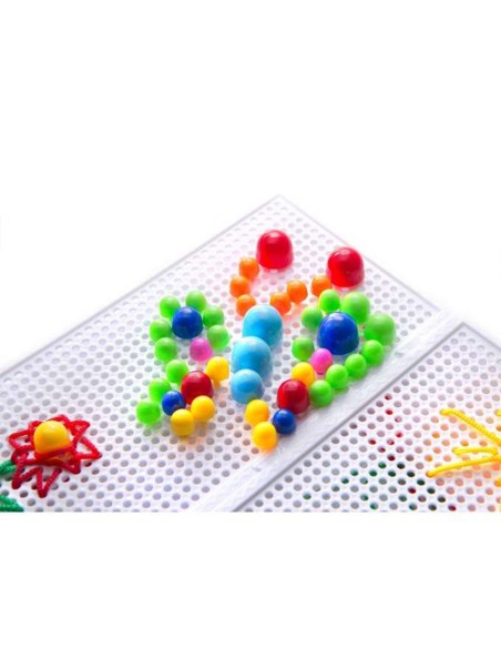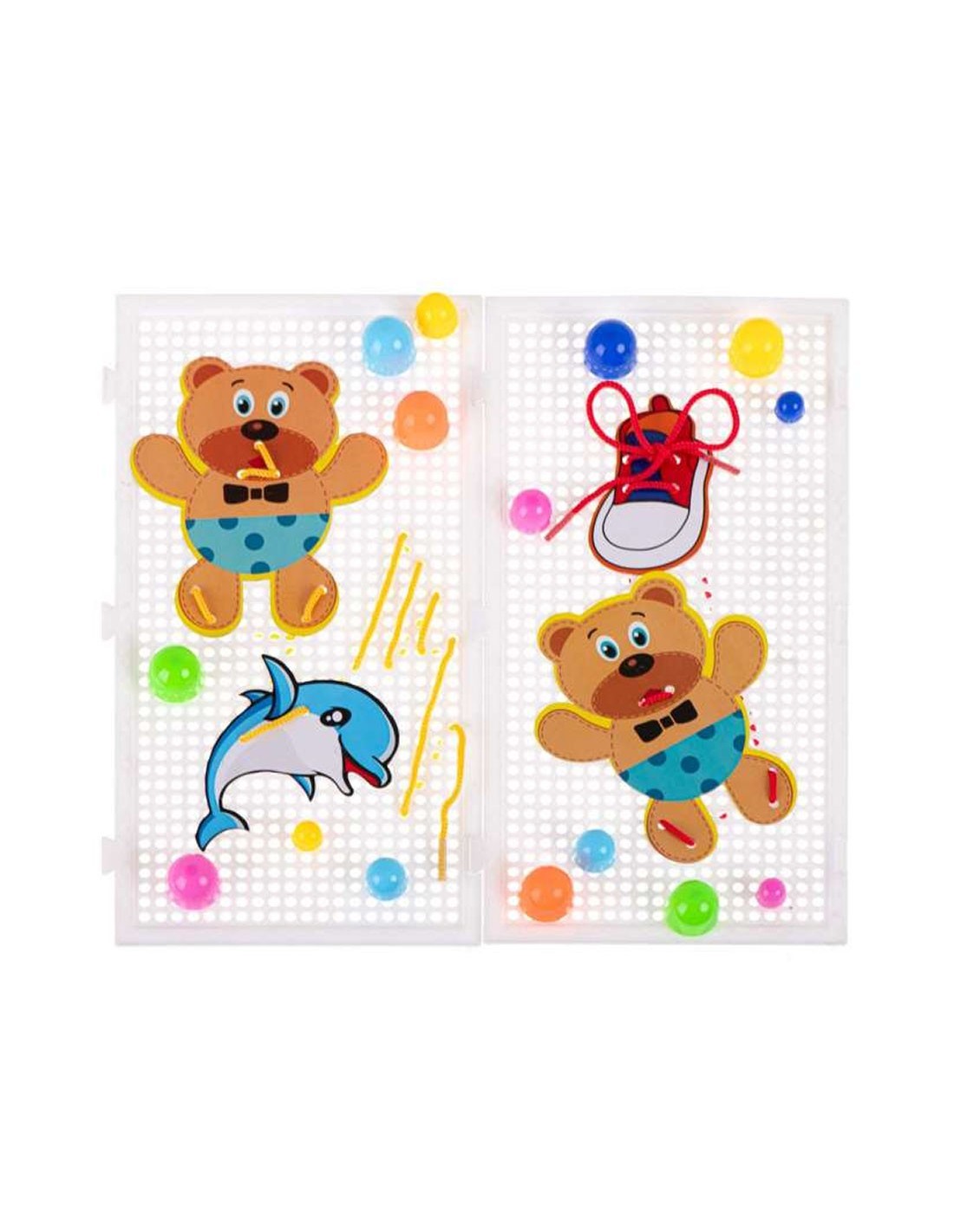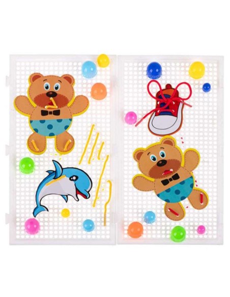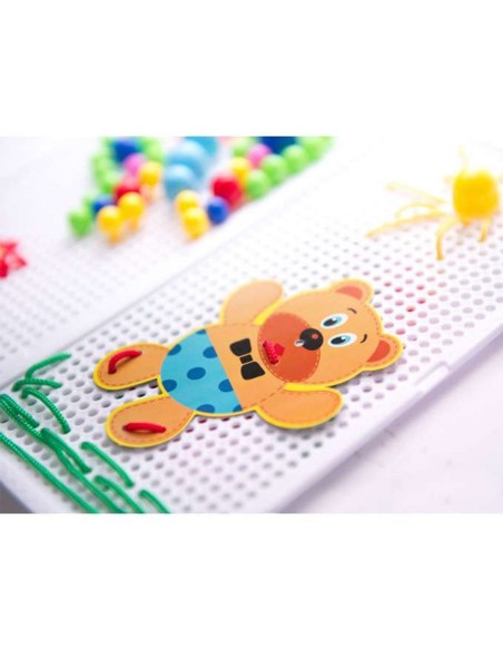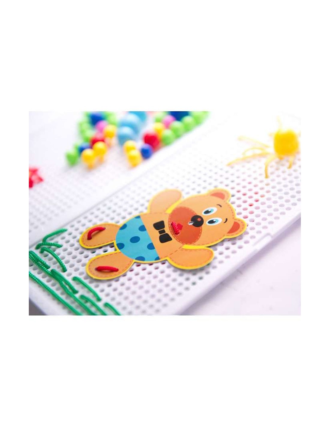 Dvi veiklos viename: Vaikas gali kurti spalvingus paveikslėlius naudodamas įvairių dydžių „grybukus“ (nykščių segtukus) arba mokytis siuvimo technikų perverdamas spalvotus raištelius pro perforuotas lentas.