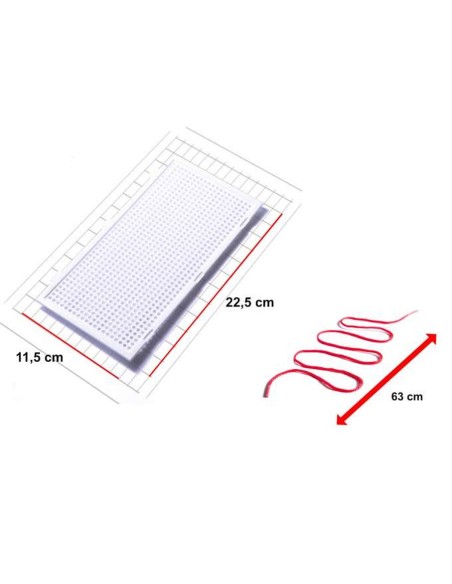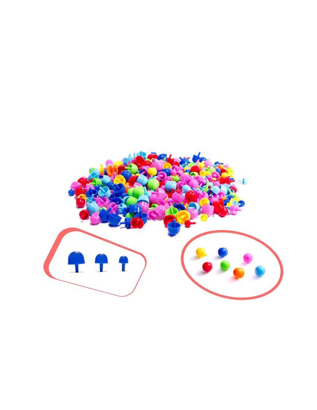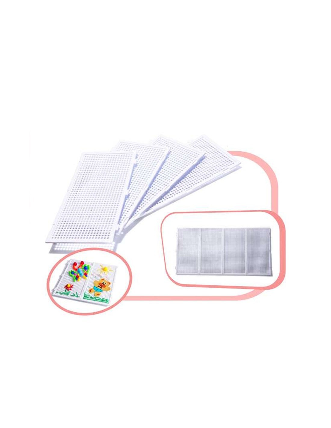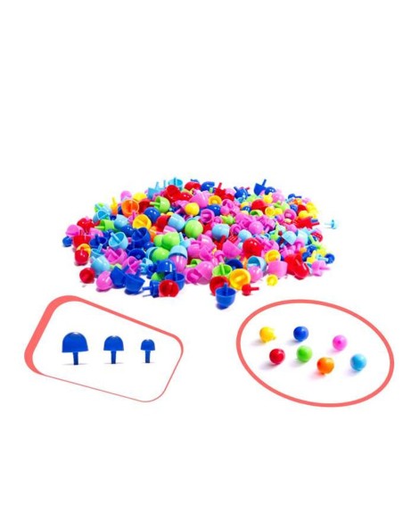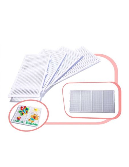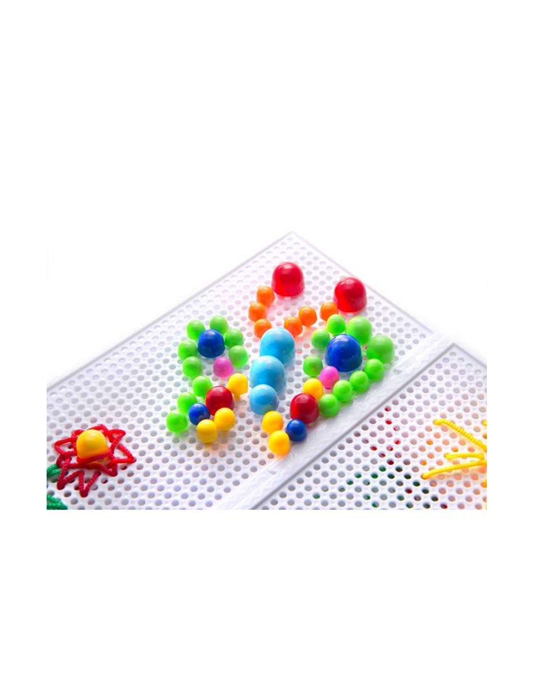 Dvi veiklos viename: Vaikas gali kurti spalvingus paveikslėlius naudodamas įvairių dydžių „grybukus“ (nykščių segtukus) arba mokytis siuvimo technikų perverdamas spalvotus raištelius pro perforuotas lentas.