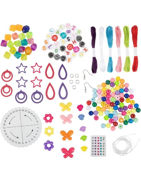 Rinkinyje rasite: 6 skirtingų spalvų siūlus, permatomą virvelę, įvairiaspalvių karoliukų, auskarų, pakabukų, tvirtinimo detales.