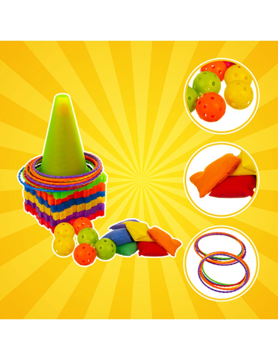 „3 viename“ pramoga: Vienas rinkinys – daugybė žaidimo variantų! Galima mėtyti žiedus ant kūgių, taikyti kamuoliukus į taikinius ar varžytis mėtant spalvingus maišelius.