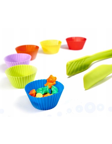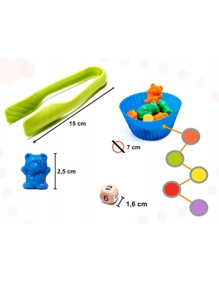 Vaikas gali skaičiuoti meškiukus, mokytis sudėties ir atimties, taip pat dėlioti meškiukus pagal spalvas.