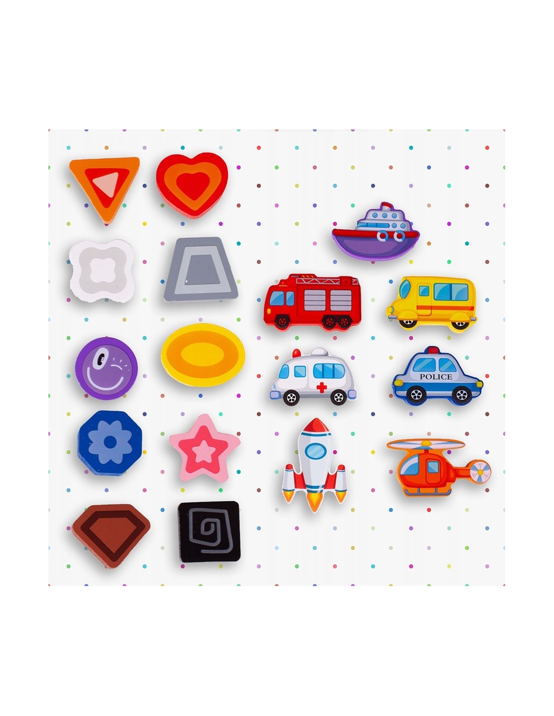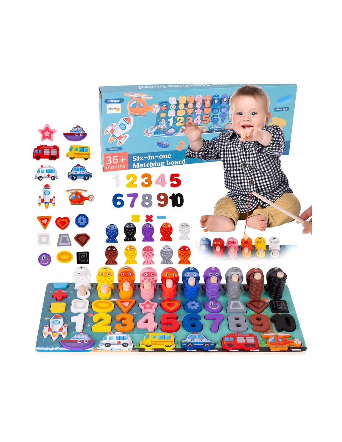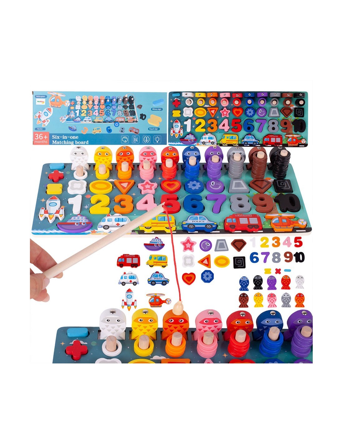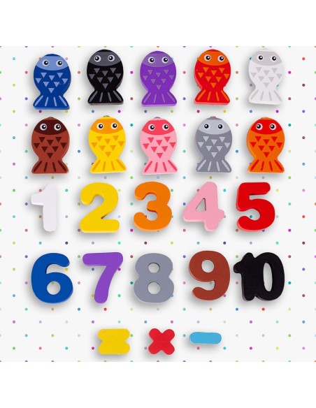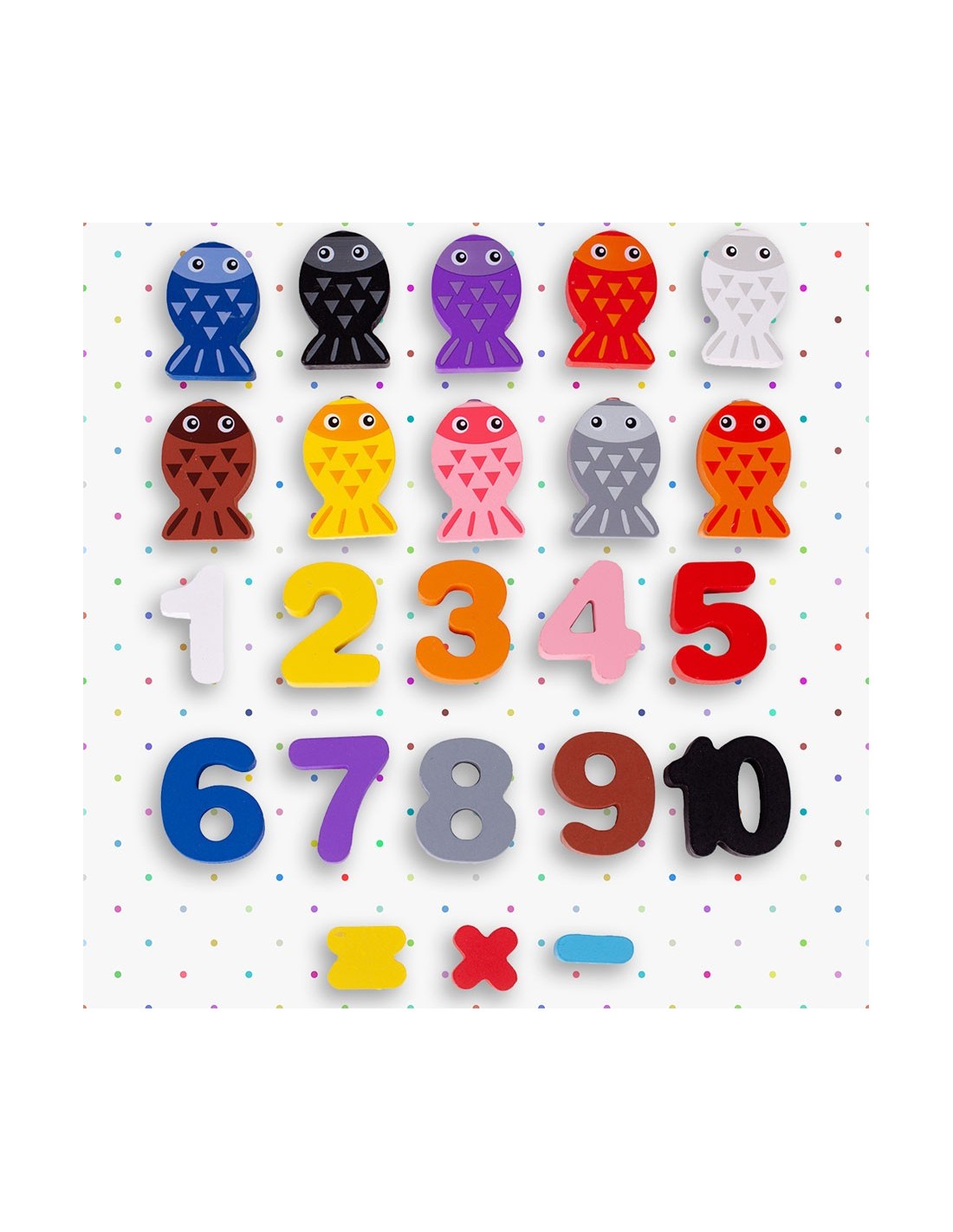 Rinkinyje rasite: 10 žuvyčių, 10 formelių, 10 skaičių, 7 transporto priemones, 3 matematinius ženklus, 10 medinių stulpelių žiedams sudėti, 1 meškerę.