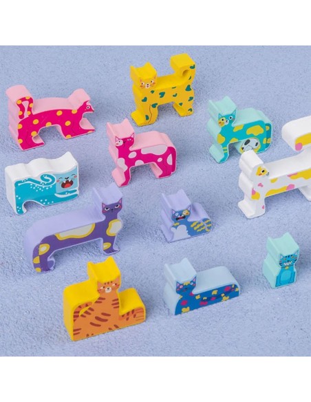 Šis žaislas susideda iš 12 medinių blokelių, kuriuose yra įvairių katės formų. Vaikai gali sujungti blokelius, kad sukurtų savo unikalų gyvūnų pasaulį. Be to, šis žaislas padeda vaikams lavinti savo koordinaciją, smukliąją motoriką ir spalvų bei formų atpažinimo įgūdžius.
