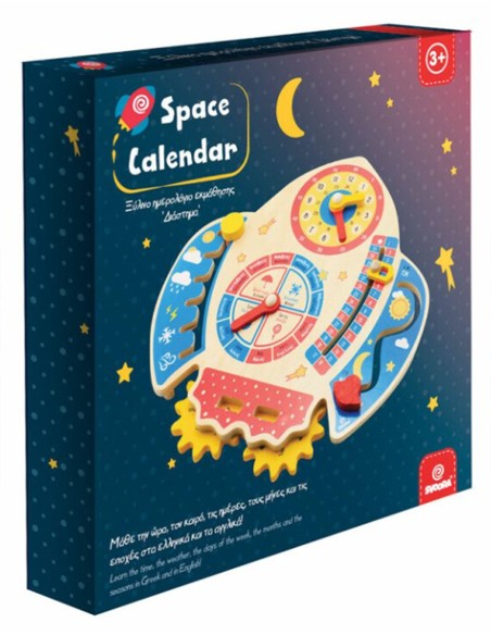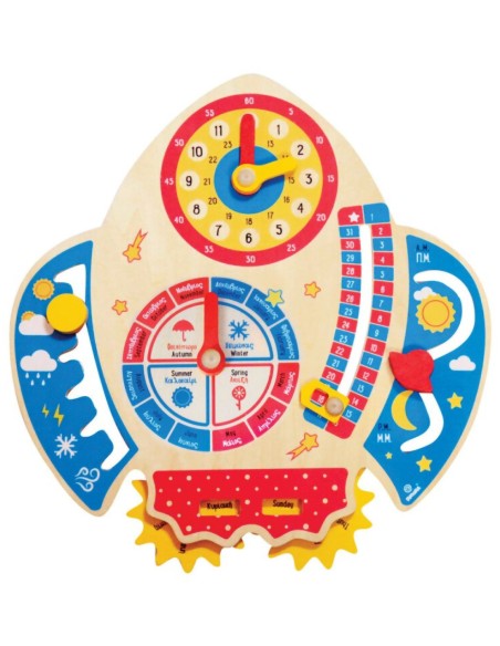 Tai yra edukacinis žaislas vaikams, pagamintas iš medžio. Jis atrodo kaip raketa ir turi daug besisukančių elementų, kurie padeda vaikams mokytis laiko, metų laikų, dienų, mėnesių, oro sąlygų ir savaitės dienų. Žaislas yra ryškių spalvų ir turi įvairių detalių, kurios patraukia vaikų dėmesį.