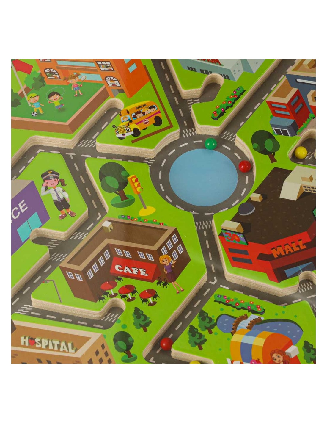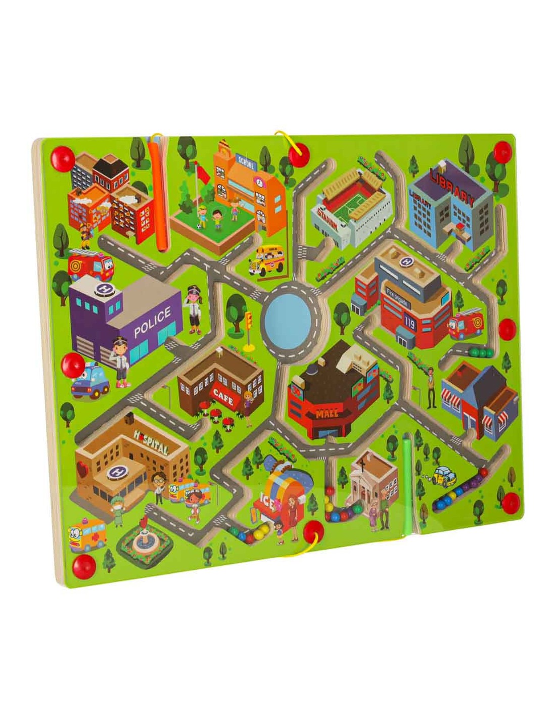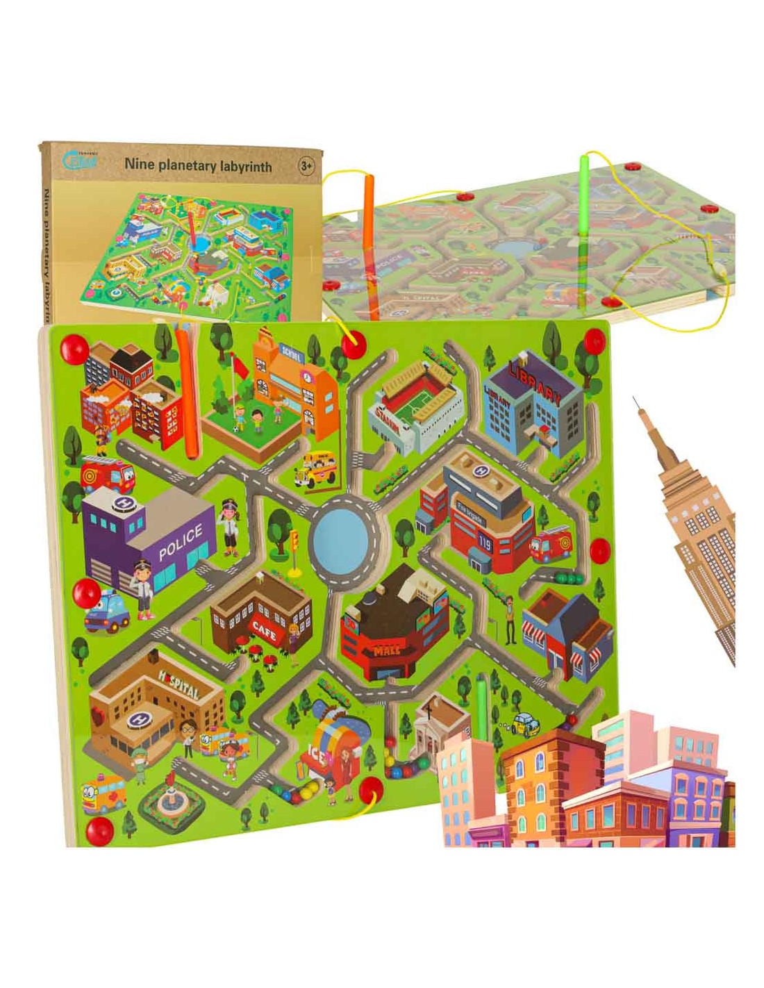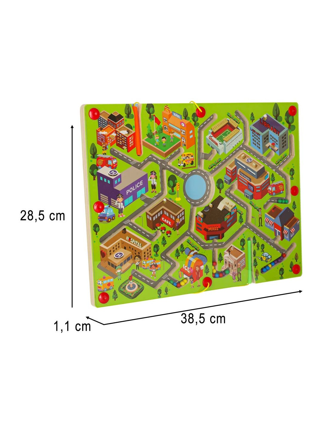 Medinė lenta vaizduoja spalvingą miestą su paslėptais maršrutais ir nurodytais tikslais. Vaiko užduotis? Veskite slystančius kamuoliukus per visą labirintą naudodami tikslų įrankį – magnetinį žymeklį. Rinkinyje yra du specialūs žymekliai kamuoliukams perkelti , kurie pritvirtinti virvele , kad jie niekada nepasimestų – visada pasiruošę pramogoms, kad ir kur bebūtumėte.