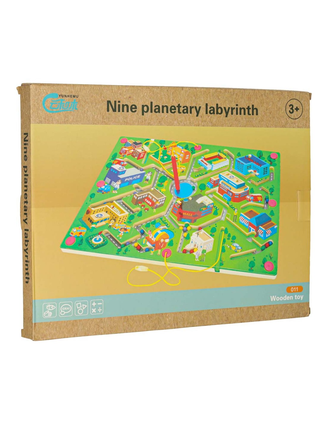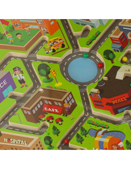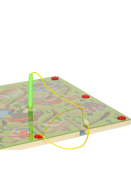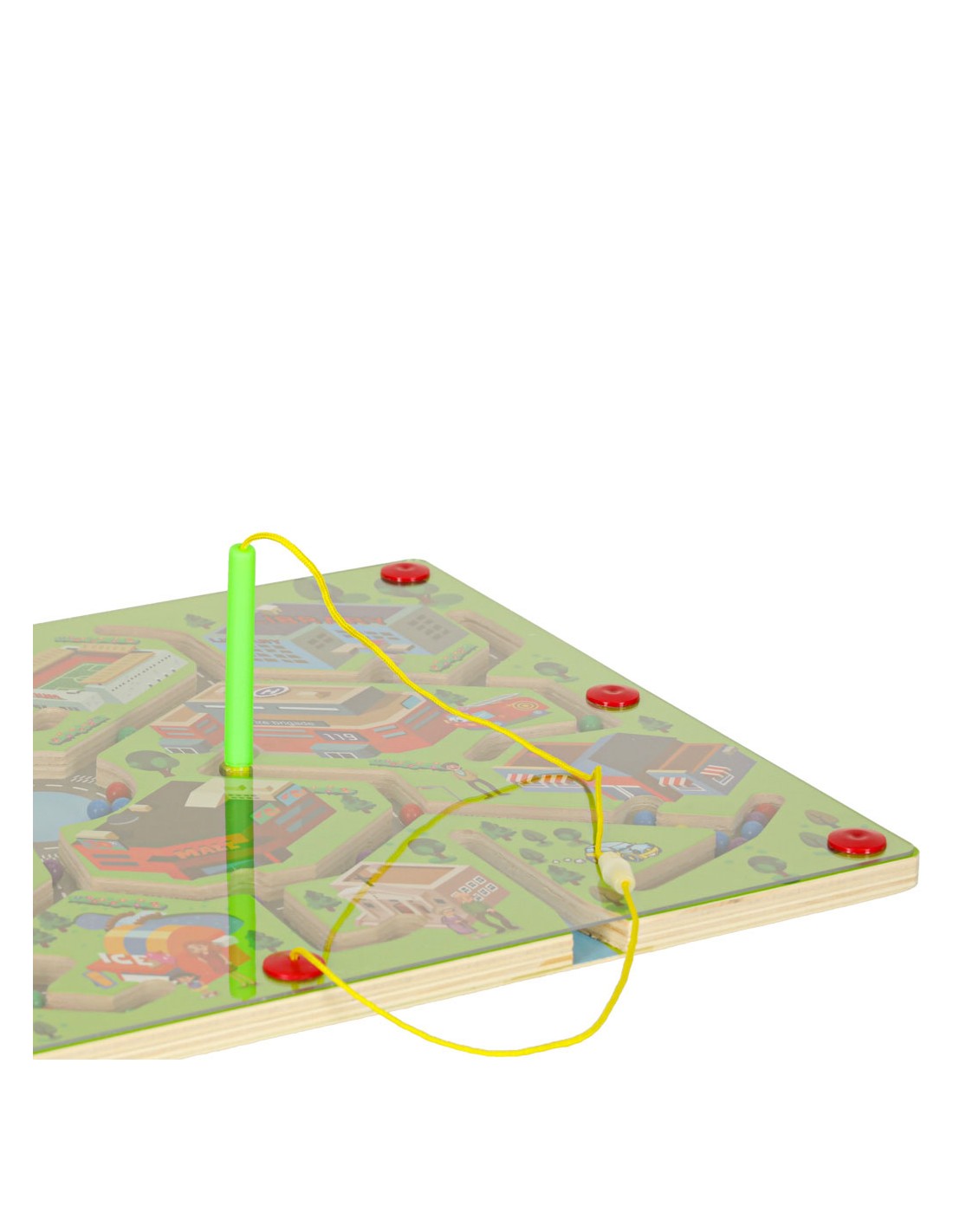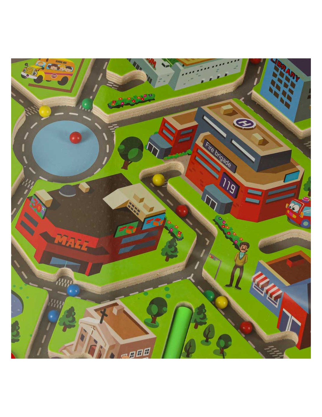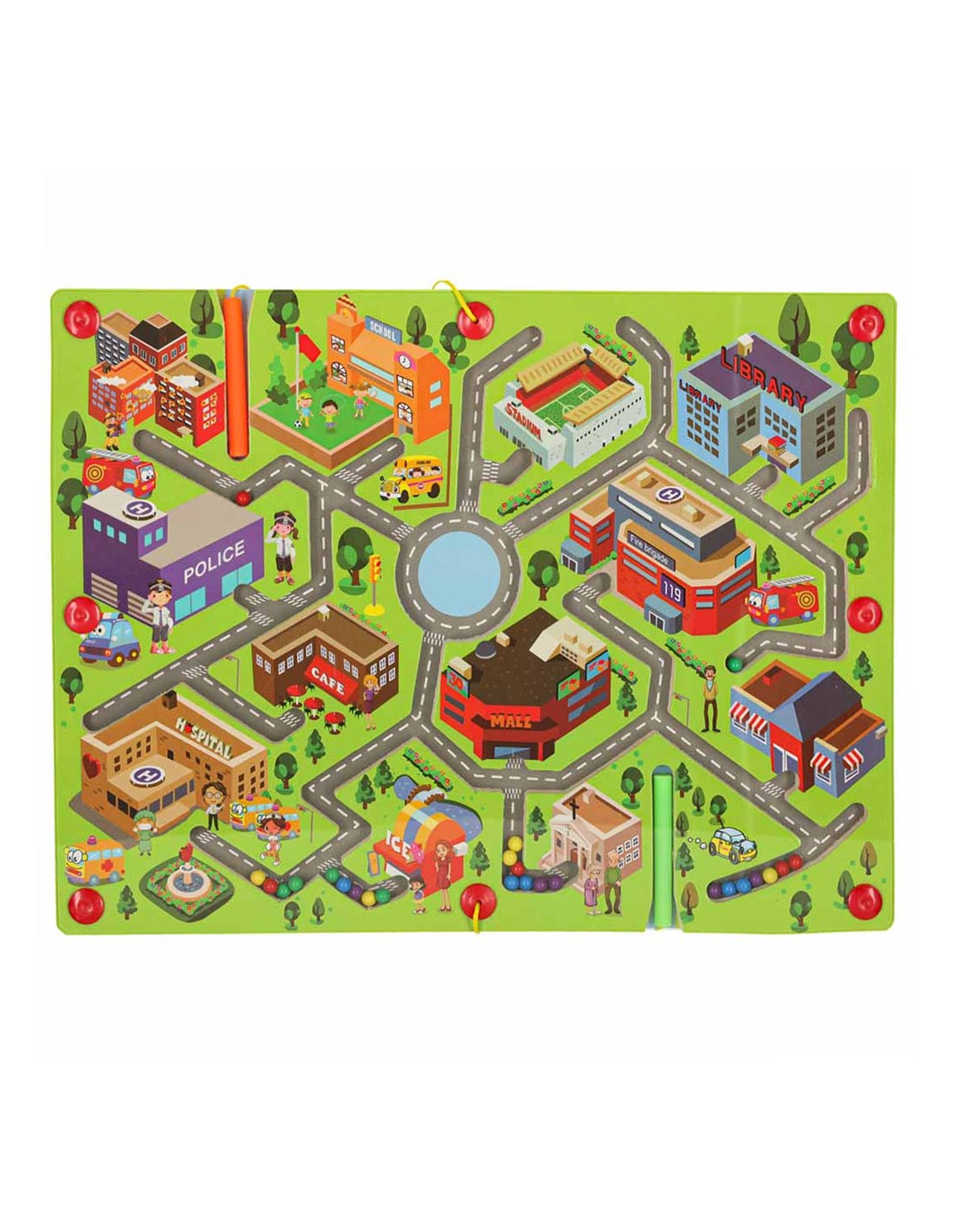 Medinė lenta vaizduoja spalvingą miestą su paslėptais maršrutais ir nurodytais tikslais. Vaiko užduotis? Veskite slystančius kamuoliukus per visą labirintą naudodami tikslų įrankį – magnetinį žymeklį. Rinkinyje yra du specialūs žymekliai kamuoliukams perkelti , kurie pritvirtinti virvele , kad jie niekada nepasimestų – visada pasiruošę pramogoms, kad ir kur bebūtumėte.