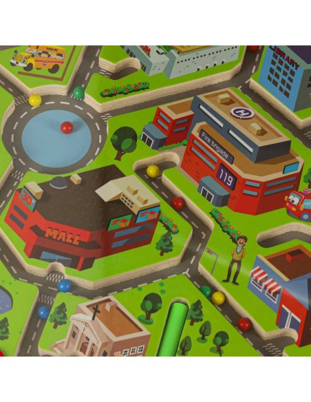 Estetiškas dizainas: Spalvingas miesto motyvas patraukia vaiko dėmesį ir skatina žaisti.