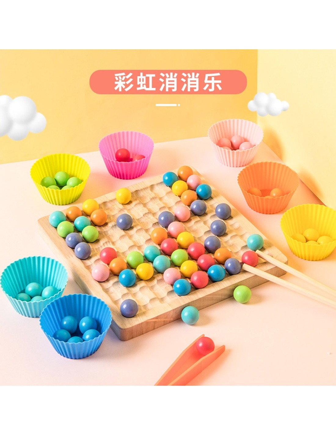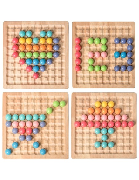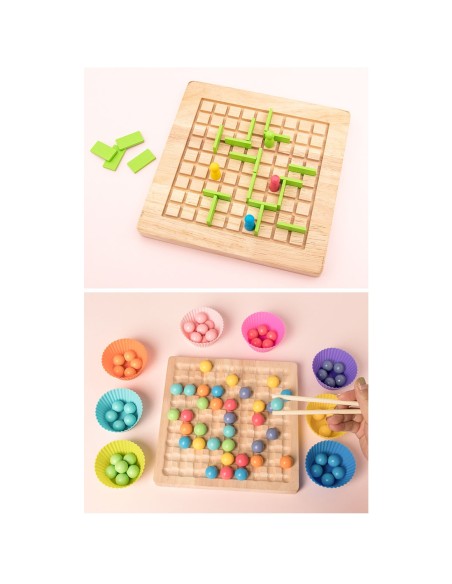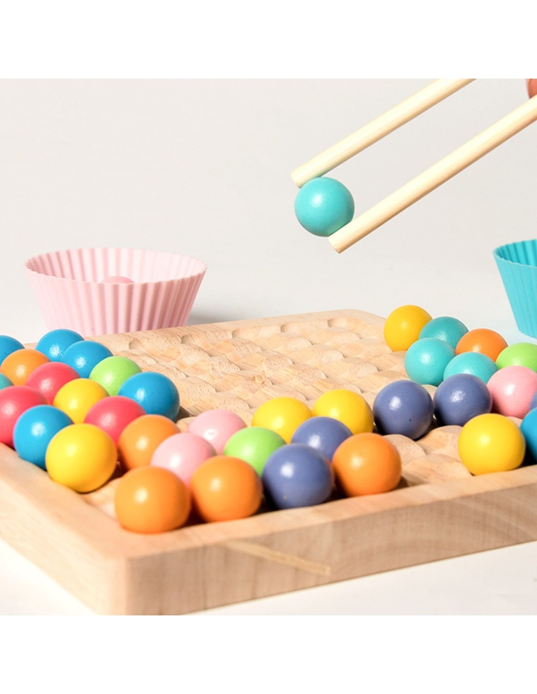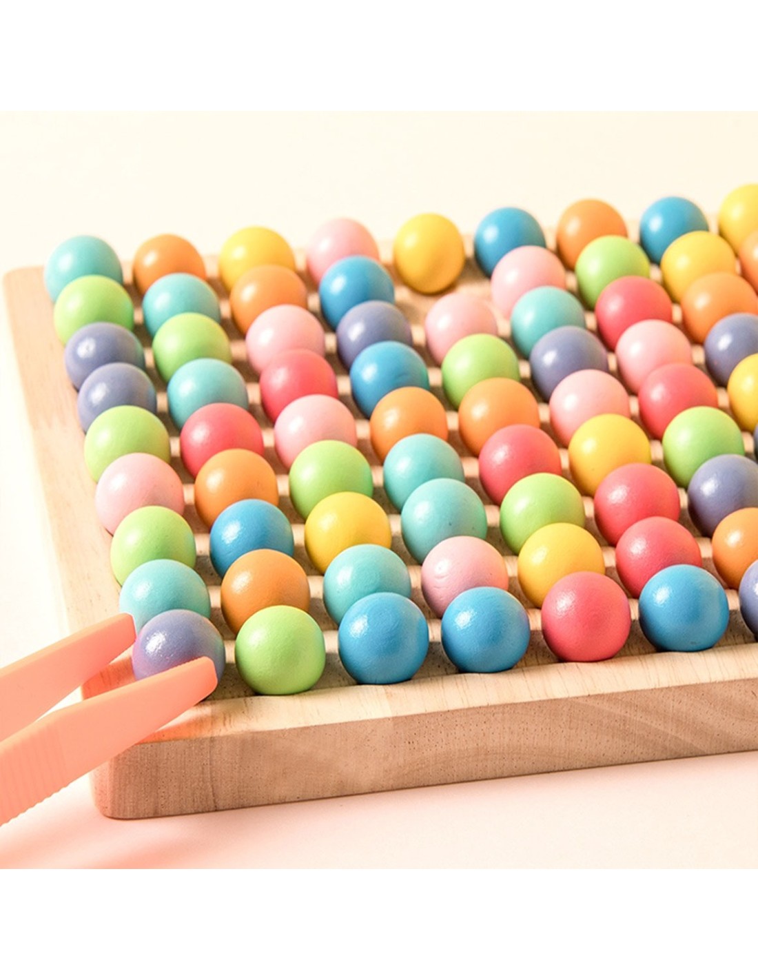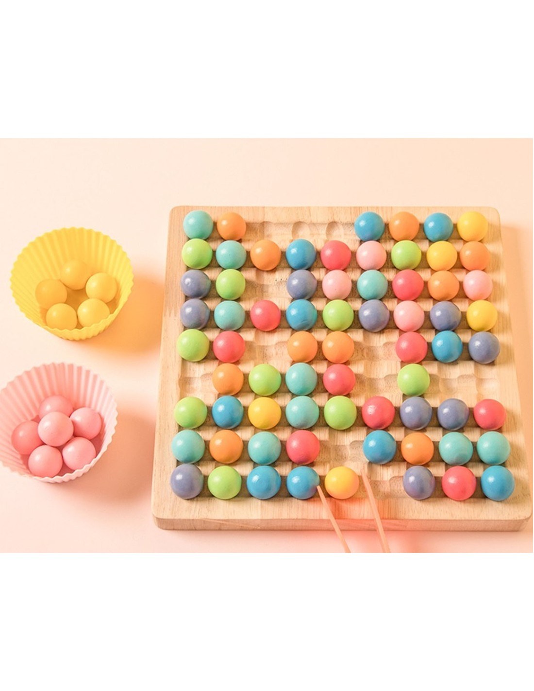 Ši spalvingų kamuoliukų mozaika – puikus edukacinis žaislas, kuris lavina net keletą svarbių vaiko įgūdžių. Pagaminta iš natūralaus medžio, ši priemonė priklauso Montessori tipo žaislams ir padeda vaikams mokytis per lytėjimą bei praktinę veiklą. Komplektą sudaro medinė lenta, spalvoti kamuoliukai, pincetas, lazdelės ir šaukštelis, todėl vaikai gali žaisti keturis skirtingus žaidimus: su pincetu, mozaika, spalvų rūšiavimu ir net labirintu. Tai ne tik smagi, bet ir naudinga veikla, skatinanti rankų-akių koordinaciją, smegenų mąstymą ir logiką.