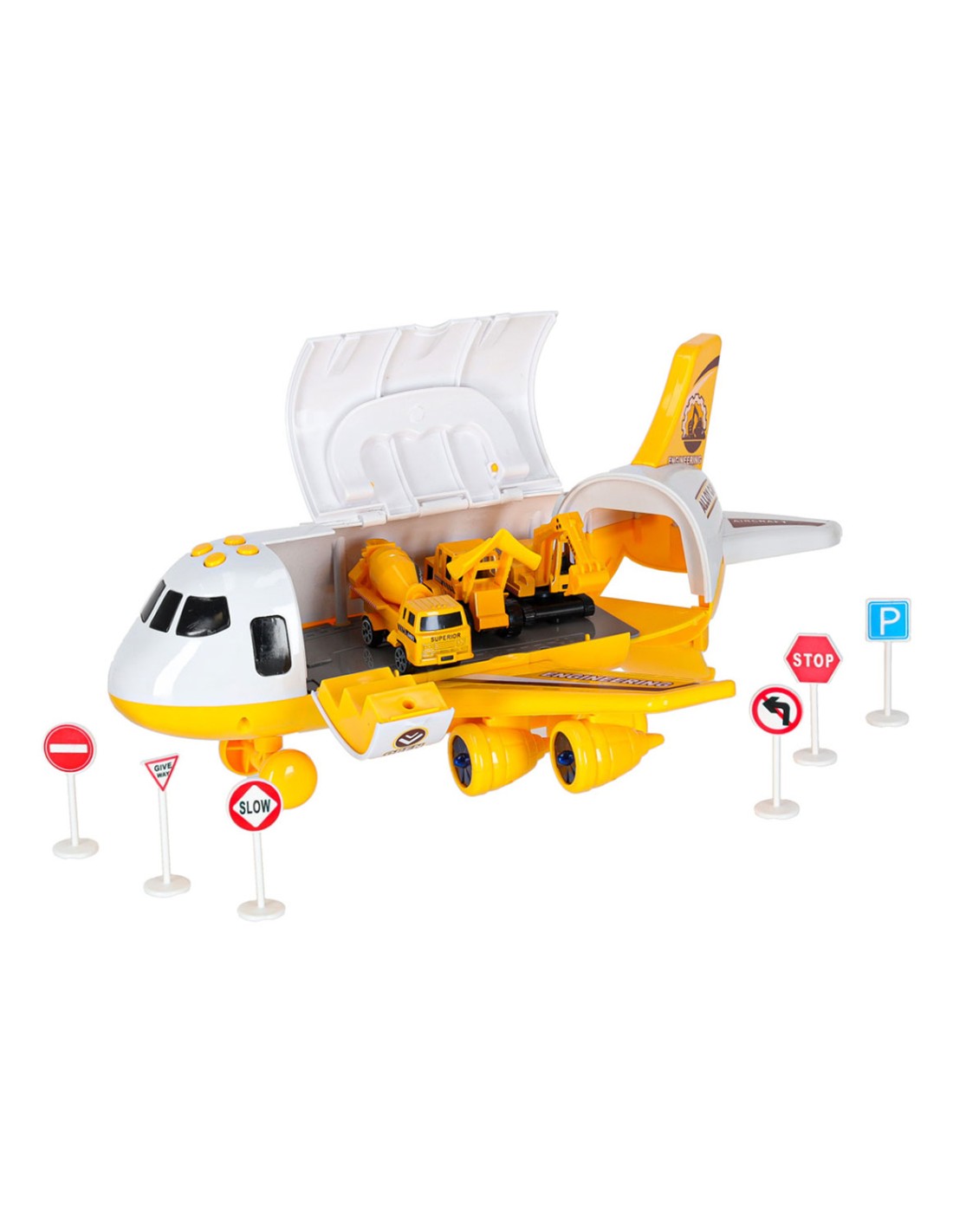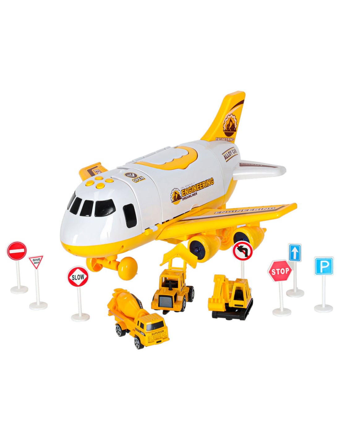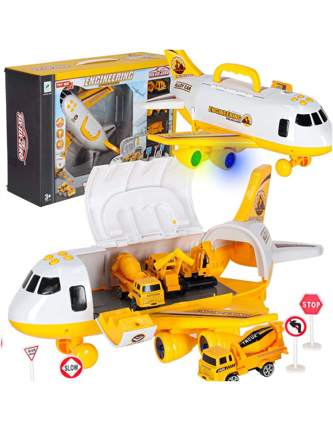Didelis lėktuvas-transporteris su 3 statybinėmis mašinomis! Šviesos, garsai, rampa ir kelio ženklai. Tobula dovana inžinieriams nuo 3 m. Statyk savo miestą dabar!