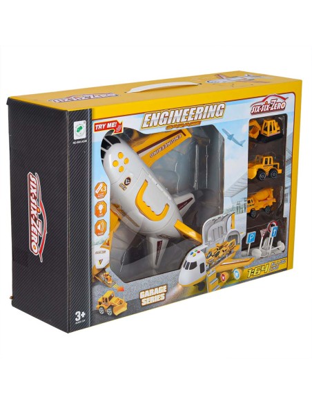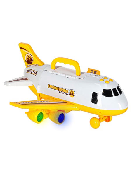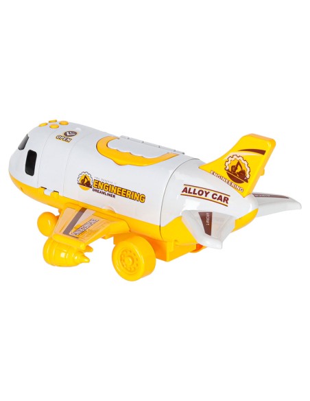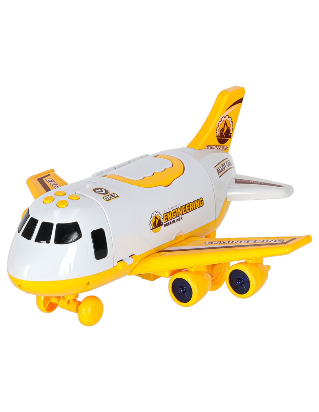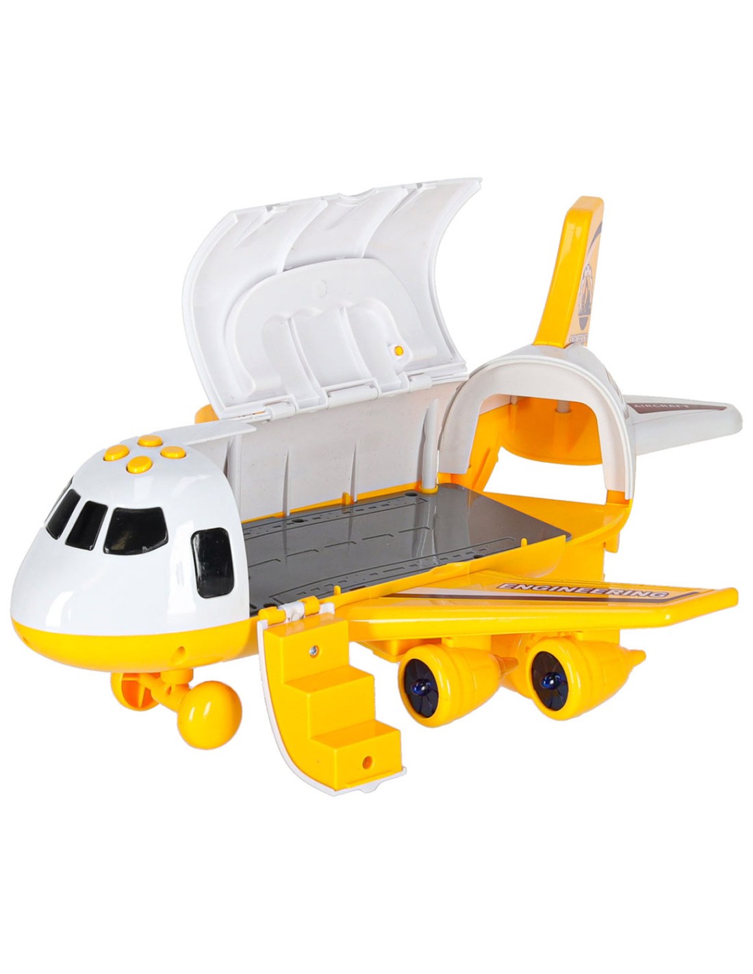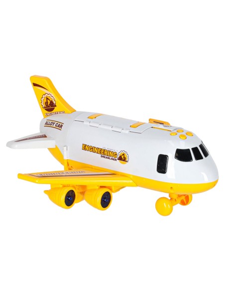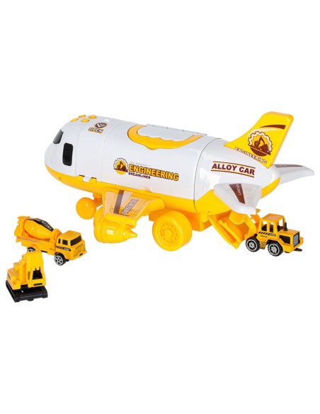 Didelis lėktuvas-transporteris su 3 statybinėmis mašinomis! Šviesos, garsai, rampa ir kelio ženklai. Tobula dovana inžinieriams nuo 3 m. Statyk savo miestą dabar!