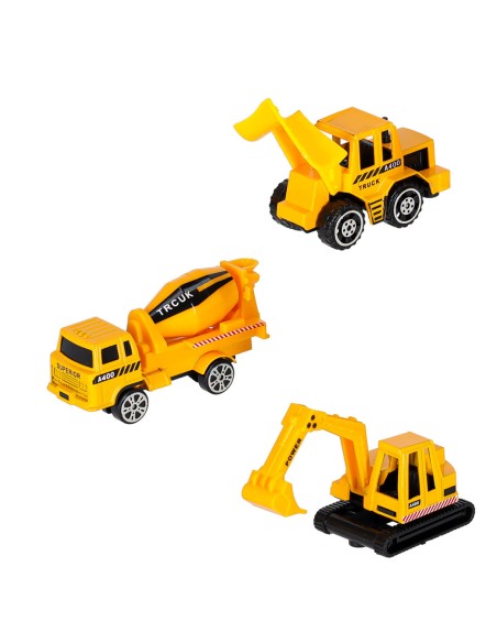 Pilnas technikos parkas: Komplekte rasite 3 geltonas mašinas: ekskavatorių su judančiu kaušu, betono maišyklę ir buldozerį.