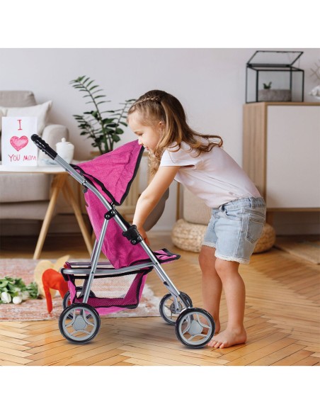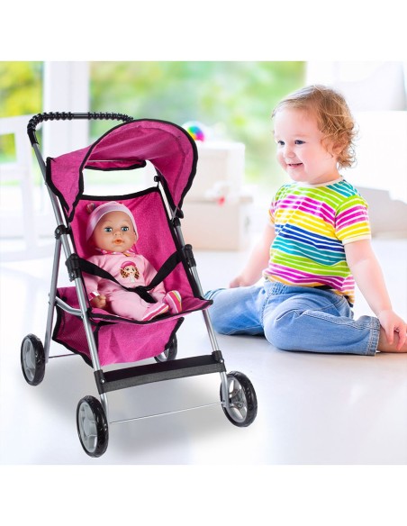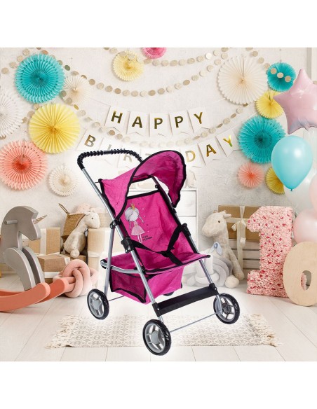 - Reguliuojamas stogelis apsaugo lėlę nuo "saulės" ir "lietaus".