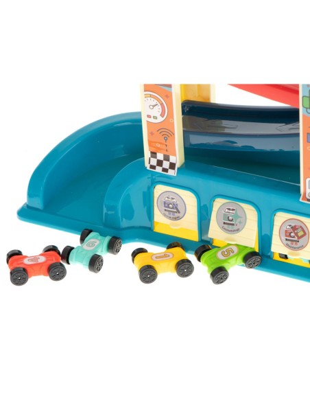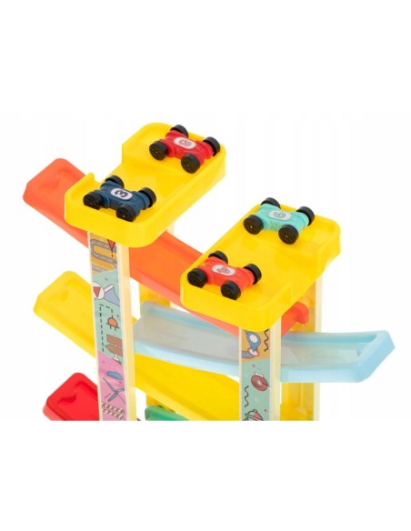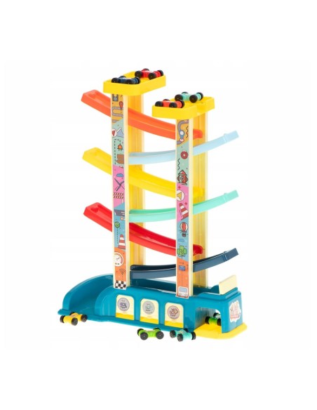 Septynių aukštų automobilių čiuožykla-serpantinas su 8 automobiliais - kuris iš spalvingų automobilių pirmasis išvažiuos į kelią?