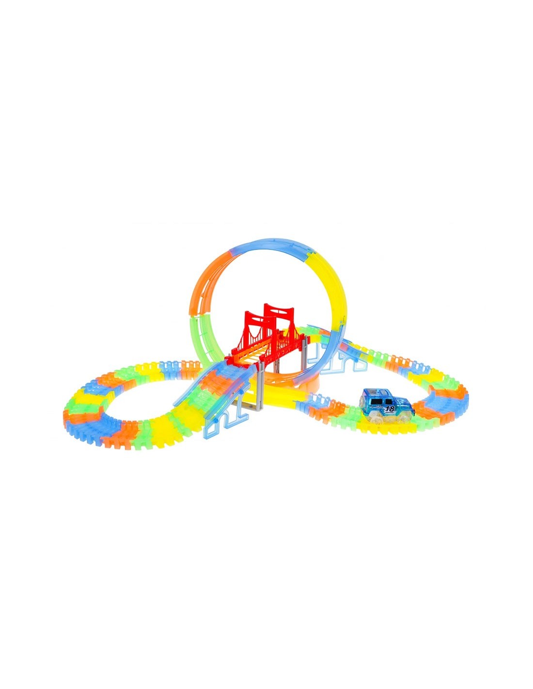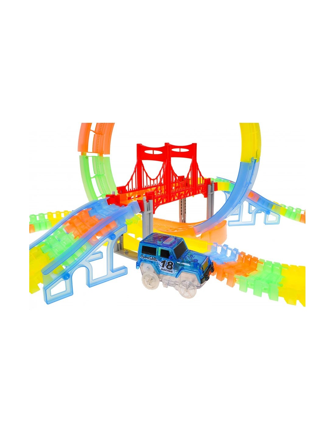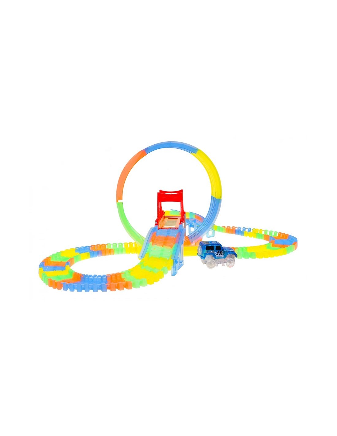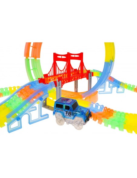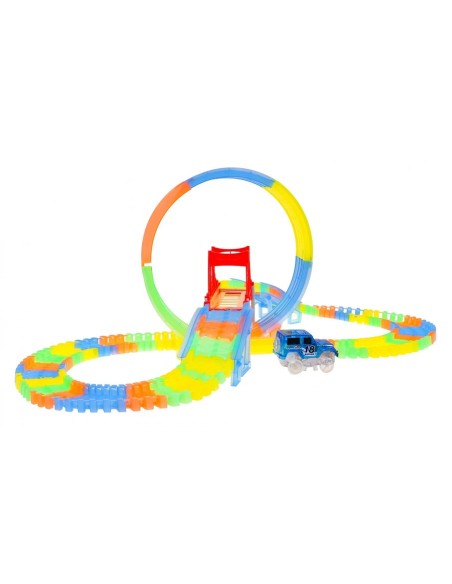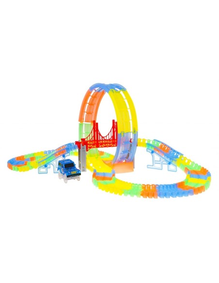 Pasiruoškite lenktynėms, kurios naktį paverčia magišku šviesų šou! Ši lanksti fluorescencinė trasa leidžia vaikams ne tik lenktyniauti, bet ir tapti tikrais inžinieriais. Išjunkite šviesą, užveskite LED automobilį ir stebėkite, kaip jis skrieja per 360 laipsnių kilpą neoninėje trasoje!
