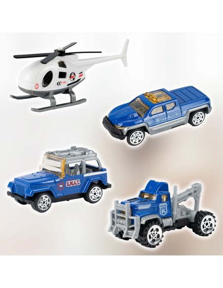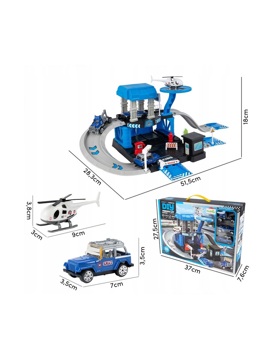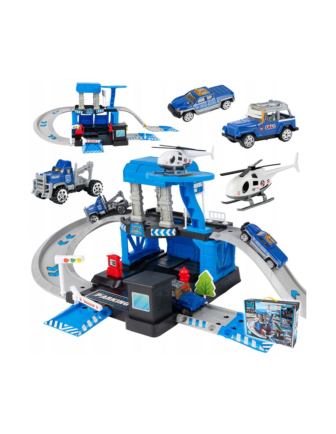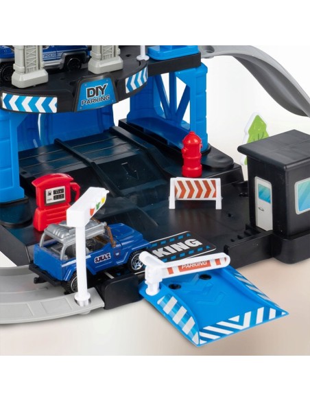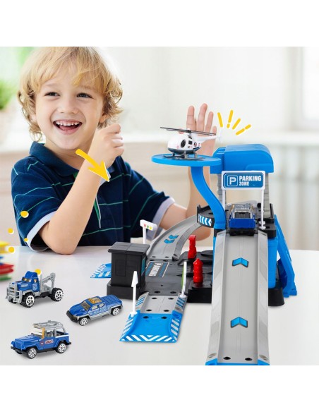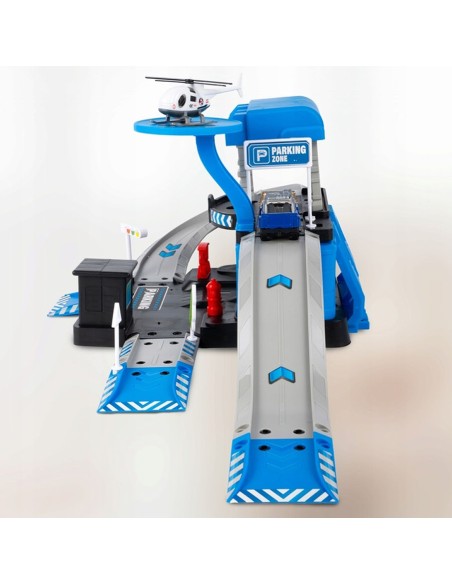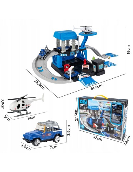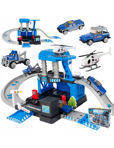 Padovanokite savo mažajam didvyriui unikalų žaislą – interaktyvią daugiapakopę automobilių stovėjimo aikštelę, sukurtą policijos nuovados tema! Šis 4 in 1 rinkinys sujungia konstravimą („pasidaryk pats“), greitą veiksmą (nuožulnios rampos) ir realistišką žaidimą vaidmenimis. Komplekte yra 3 skirtingi metaliniai policijos automobiliai (visureigis, pikapas, vilkikas) ir sraigtasparnis su nusileidimo aikštele. Tai puiki dovana, skatinanti vaizduotę ir komandinį darbą.