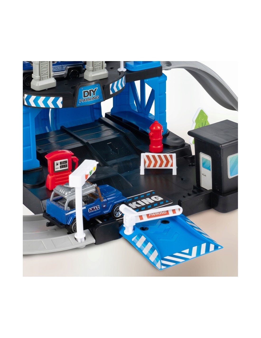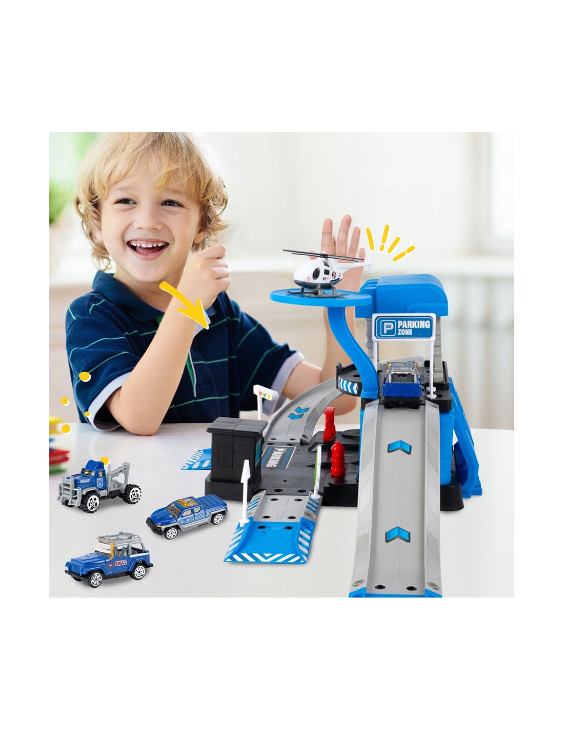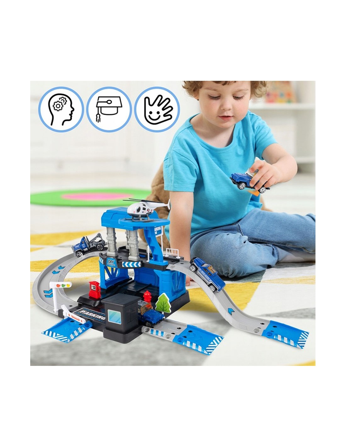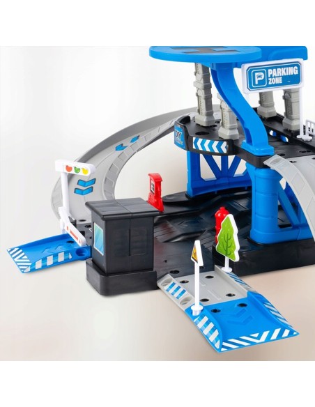 Padovanokite savo mažajam didvyriui unikalų žaislą – interaktyvią daugiapakopę automobilių stovėjimo aikštelę, sukurtą policijos nuovados tema! Šis 4 in 1 rinkinys sujungia konstravimą („pasidaryk pats“), greitą veiksmą (nuožulnios rampos) ir realistišką žaidimą vaidmenimis. Komplekte yra 3 skirtingi metaliniai policijos automobiliai (visureigis, pikapas, vilkikas) ir sraigtasparnis su nusileidimo aikštele. Tai puiki dovana, skatinanti vaizduotę ir komandinį darbą.