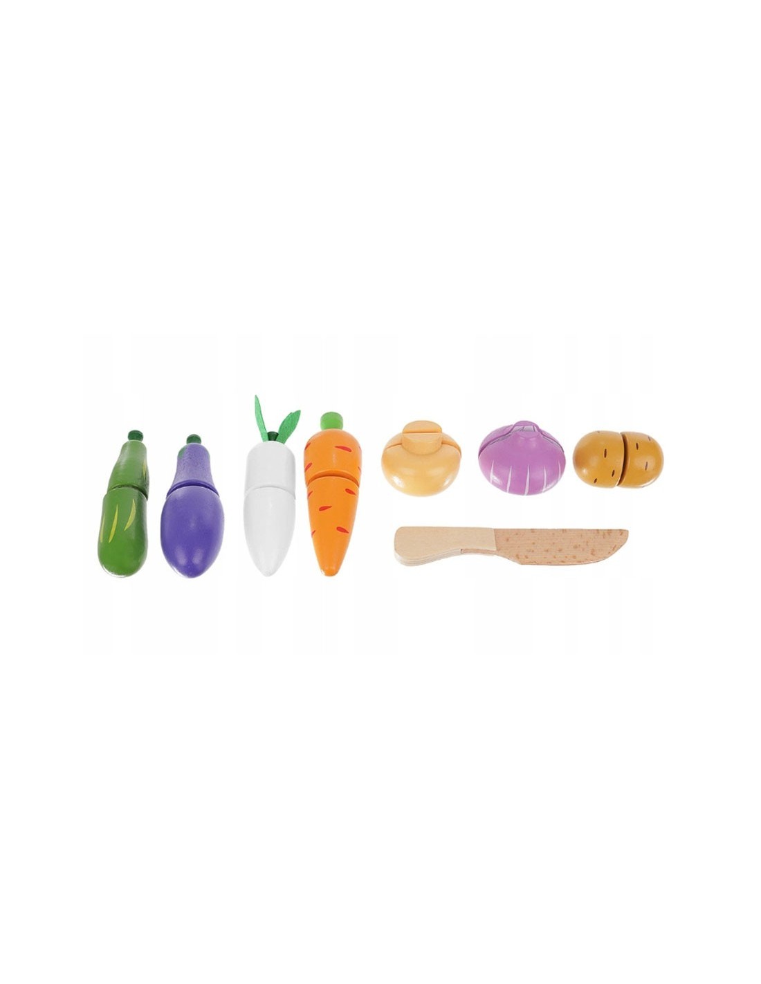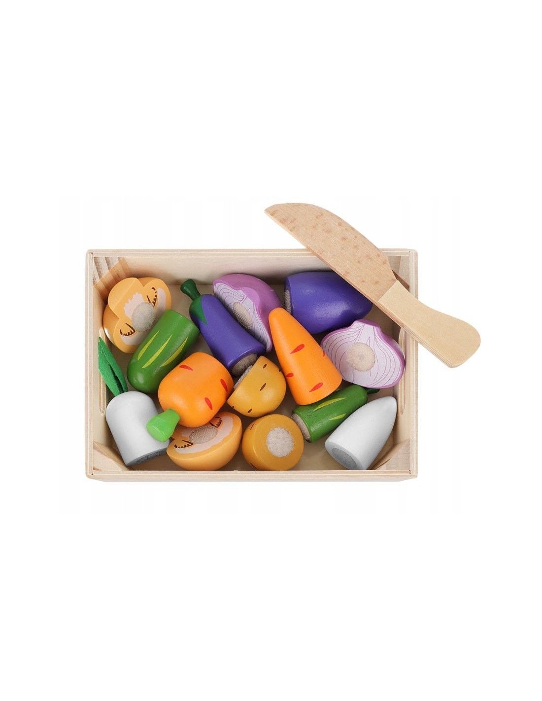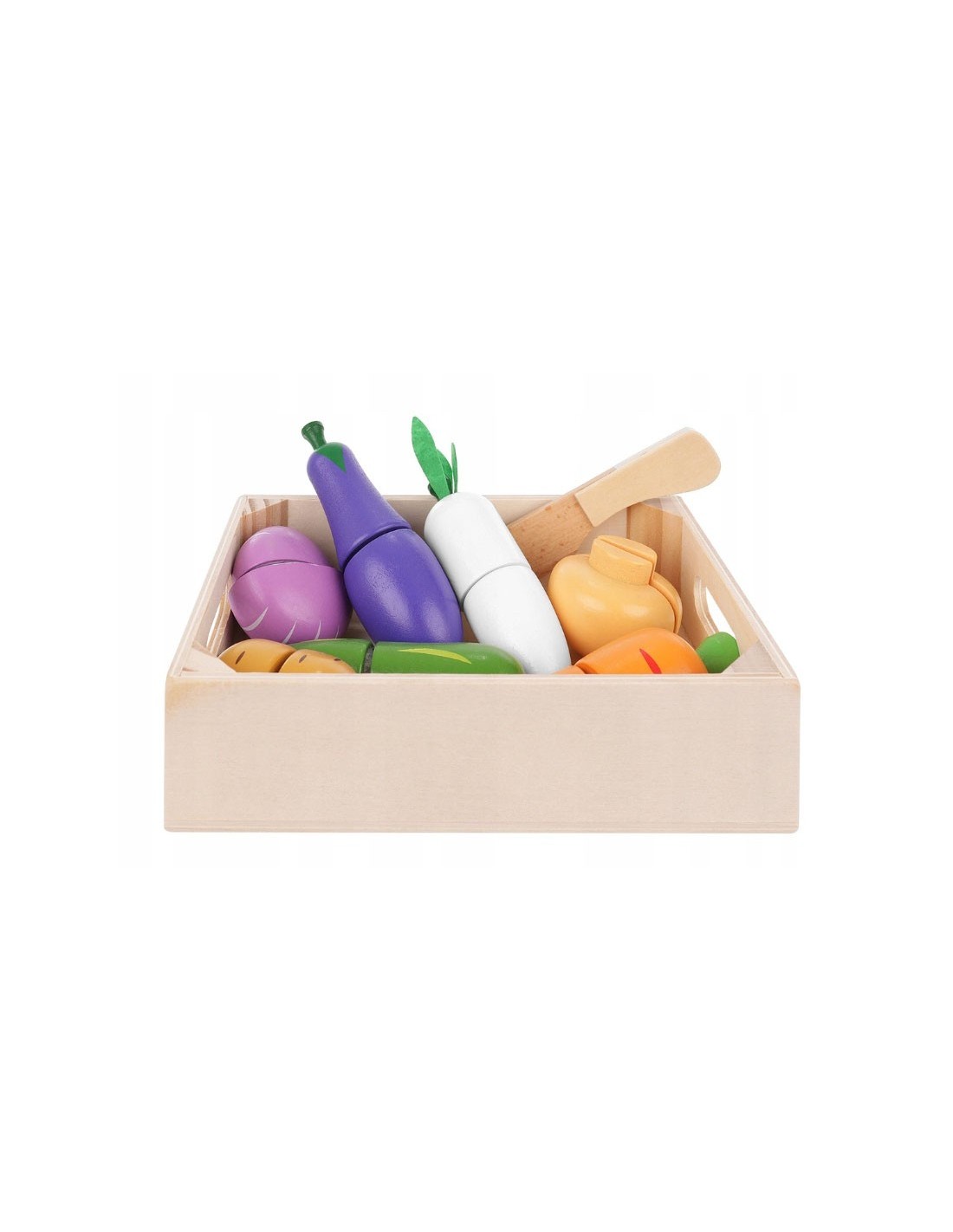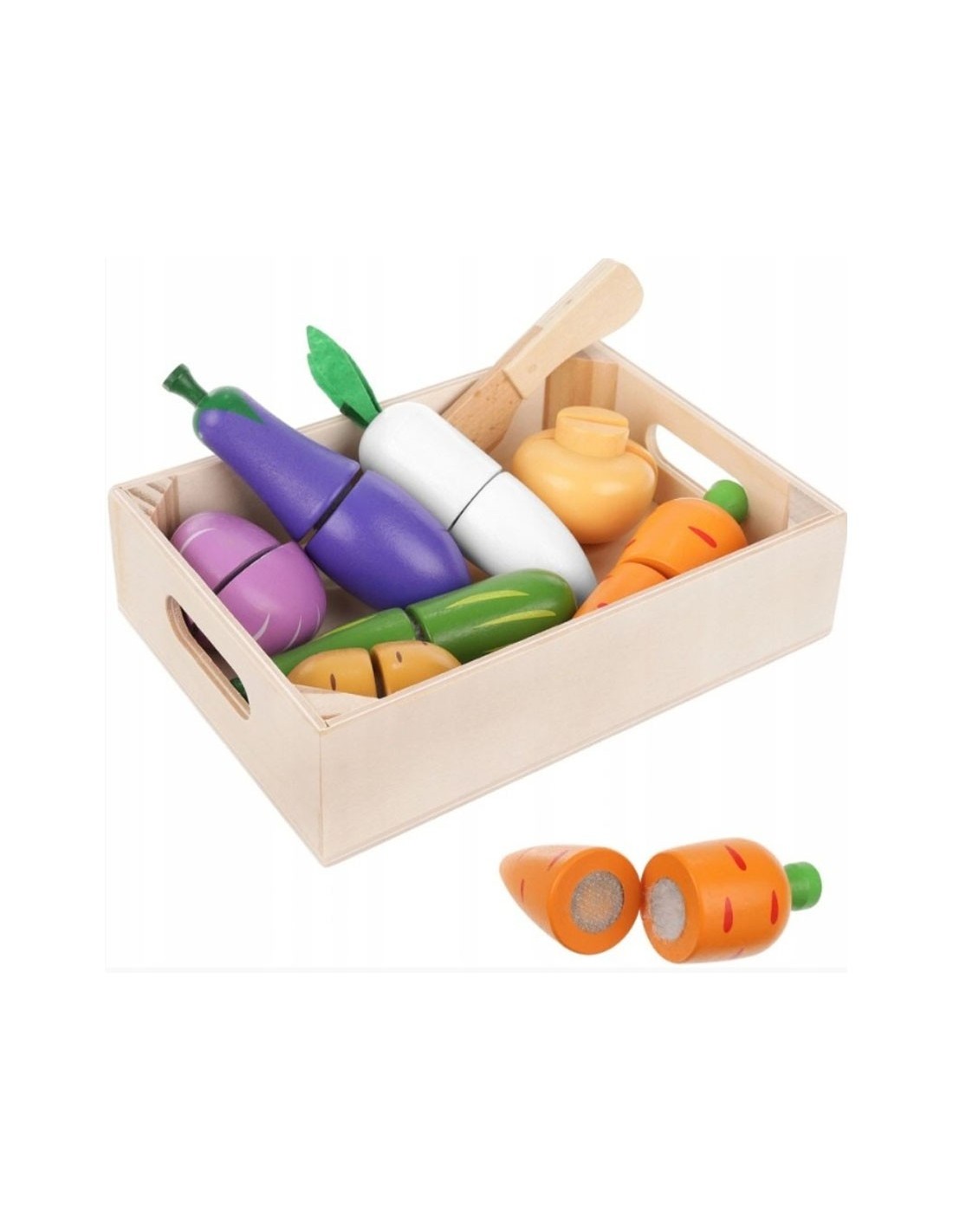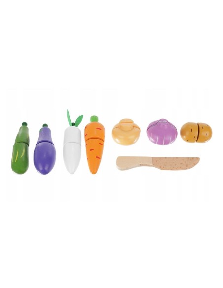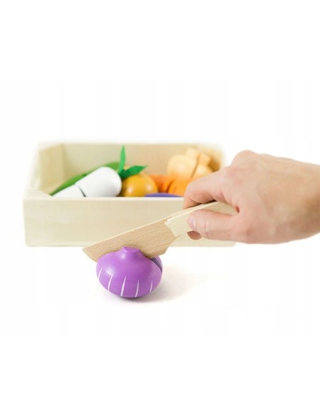 Medinis daržovių pjaustymo rinkinis su lipukais! 9 dalių komplektas dėžutėje lavina motoriką ir vaizduotę. Saugus, ekologiškas ir spalvingas žaislas nuo 3 m.