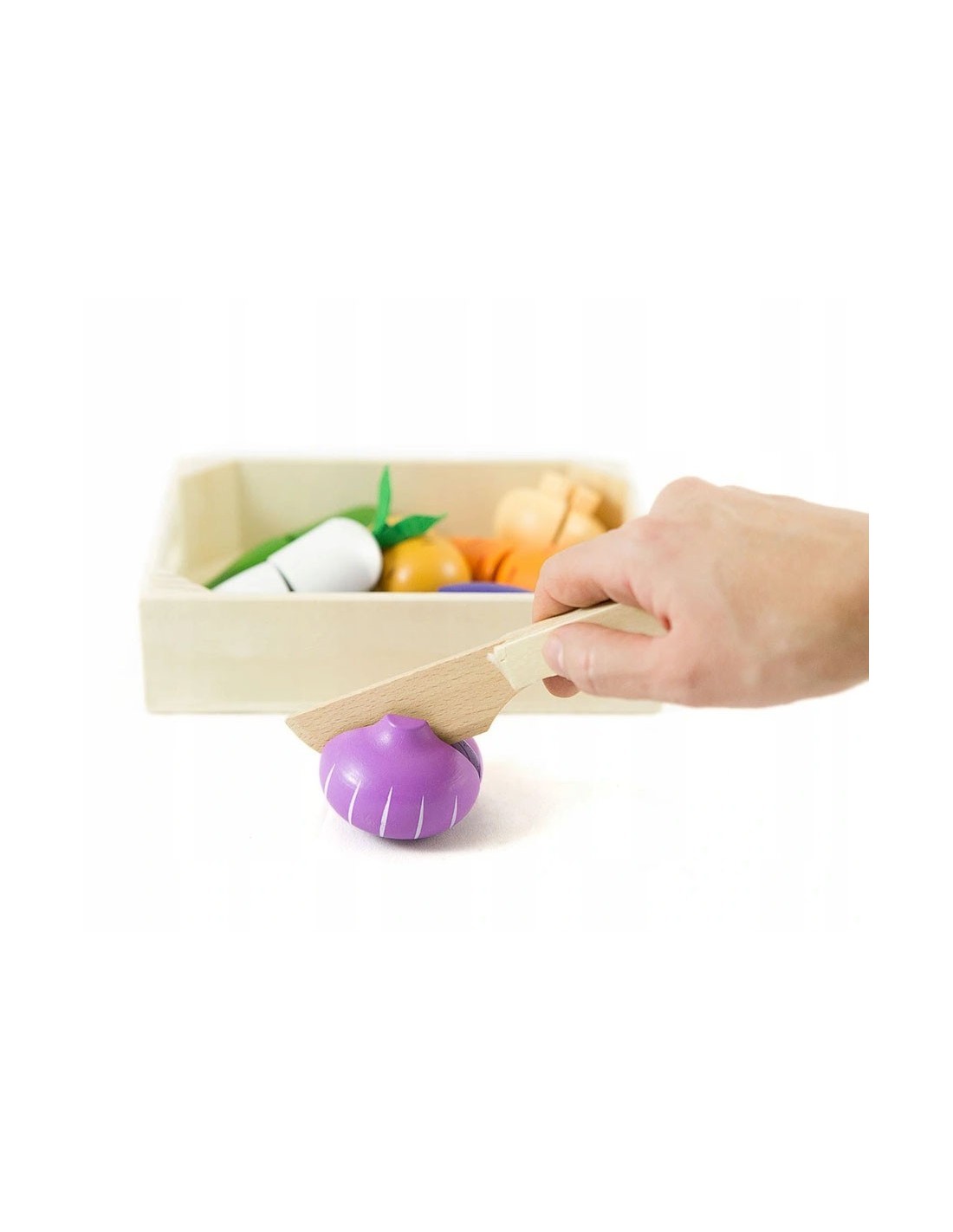 Tikroviškas pjaustymas: Dėl viduje esančių „Velcro“ lipukų daržoves galima perpjauti saugiu mediniu peiliu, o tada vėl lengvai sujungti. Tai neabejotinai paįvairina pramogą!