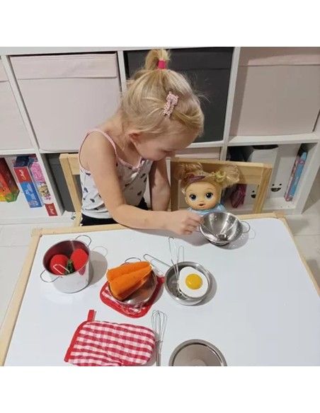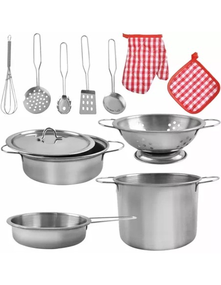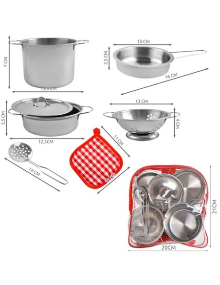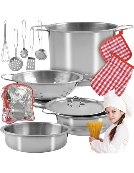 Leiskite savo vaikui pasinerti į kulinarinius nuotykius su šiuo tikrovišku metalinių puodų rinkiniu! 13 dalių rinkinys suteiks mažajam virėjui viską, ko reikia, norint imituoti tikrą virtuvę ir gaminti skanius patiekalus savo lėlėms, meškiukams ar net tėveliams!