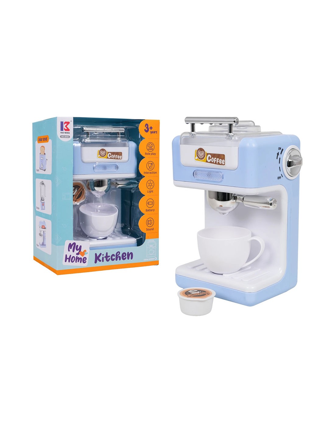 Interaktyvus mėlynas kavos aparatas vaikams nuo 3 m. Su vandens pylimo funkcija, kavos ruošimo garsais ir šviesomis. Komplekte – kapsulė ir puodelis!