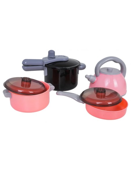 Visapusiška virtuvės įranga: Rinkinyje yra ne tik įprasti puodai, bet ir virdulys, keptuvė bei modernus greitpuodis.
