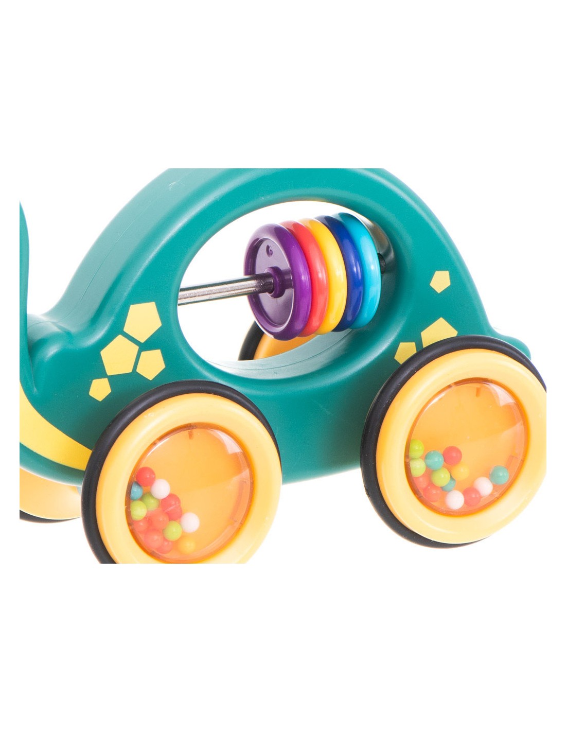 Sensorinių įgūdžių lavinimas: Ryškios spalvos ir barškučio garsai stimuliuoja vaiko regą ir klausą.
