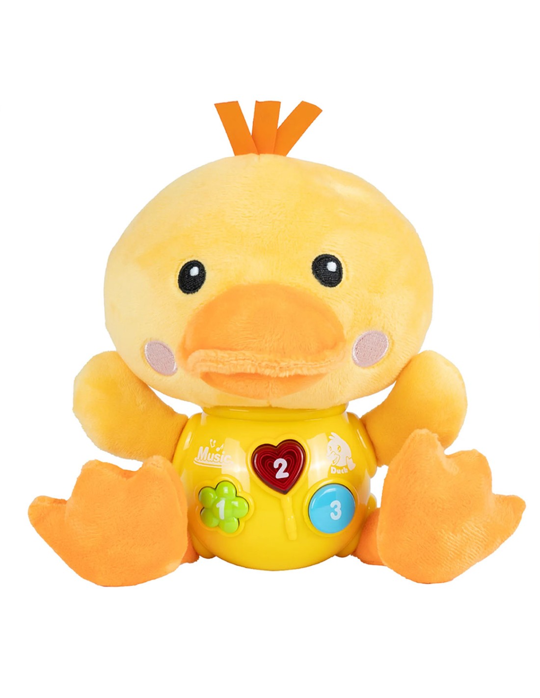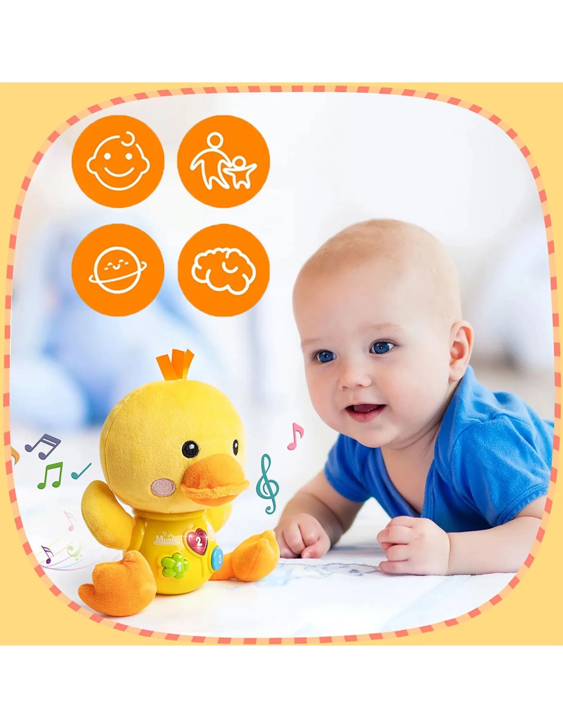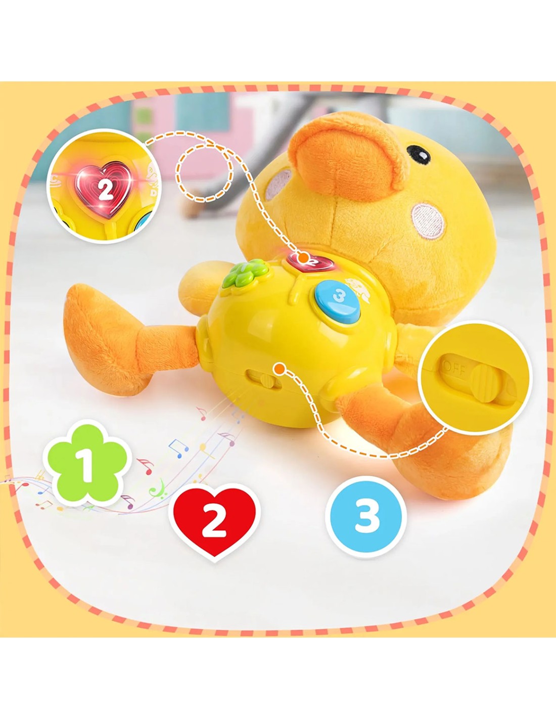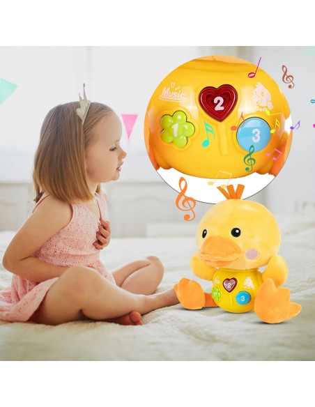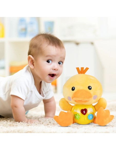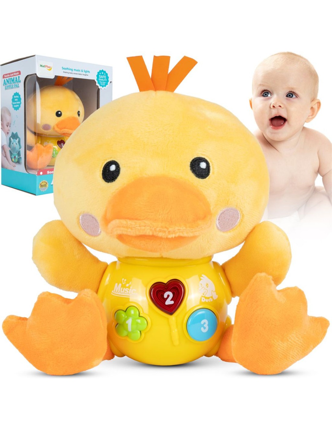 Pristatome žavingą ir minkštą interaktyvų ančiuką – puikų draugą Jūsų mažyliui nuo 6 mėnesių amžiaus! Šis spalvingas, šviečiantis ir muzikinis žaislas ne tik džiugins, bet ir padės lavinti pagrindinius vaiko pojūčius bei motorinius įgūdžius. Nuotraukos patvirtina aukštą saugumo kokybę ("SAFE QUALITY Non-Toxic") ir malonų pliušinį paviršių.