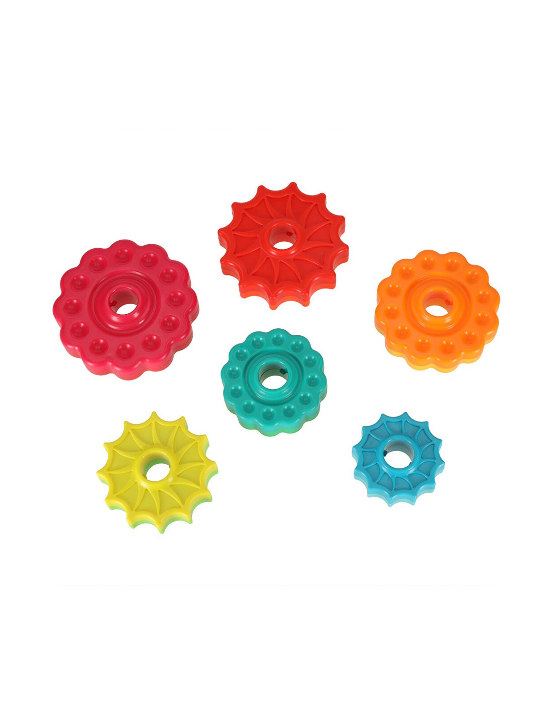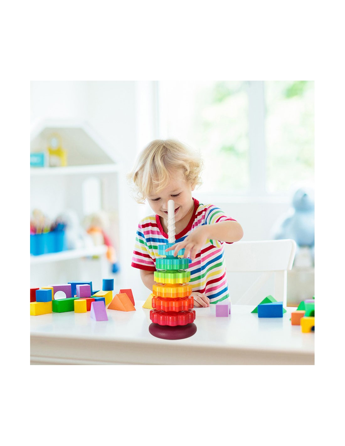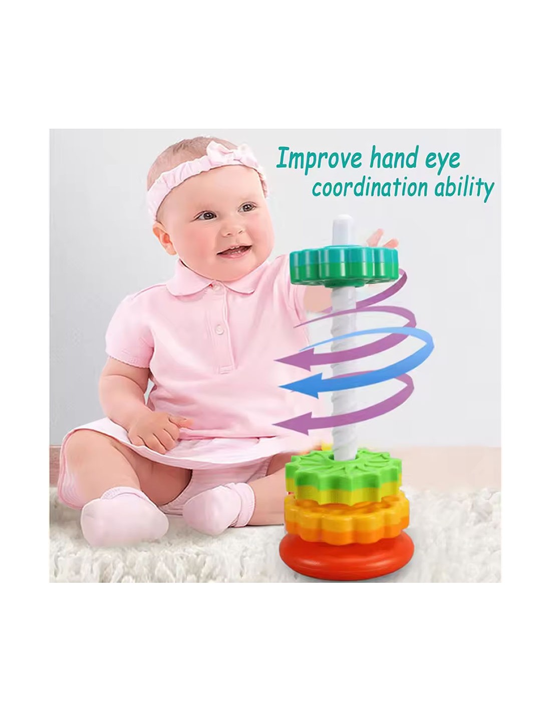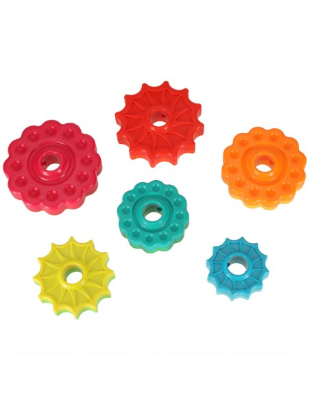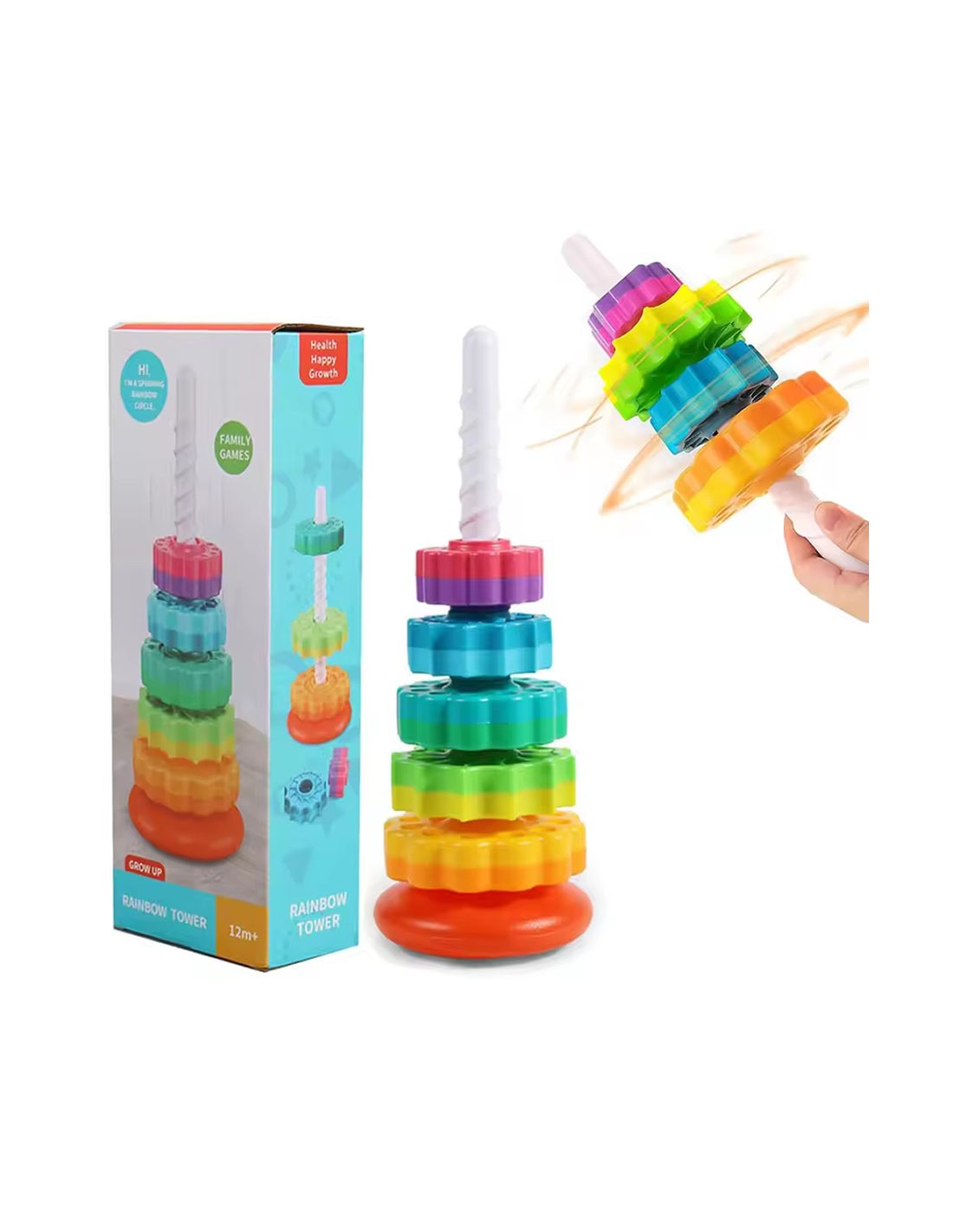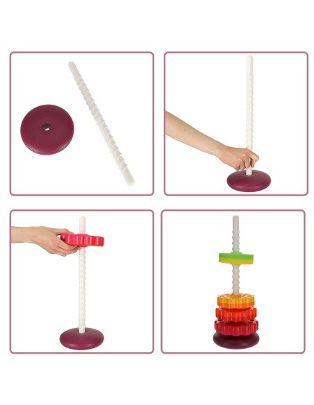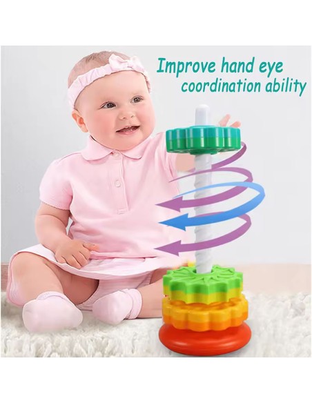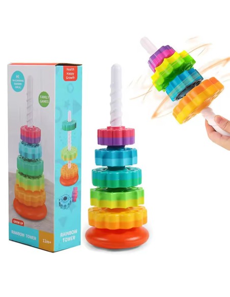Spalvingas bokštas susideda iš 6 spalvingų apskritimų su skirtingais raižiniais. Vaikas turi padėti juos ant įdomios tekstūros plastikinio strypo. Kai ratai atsikabina, jie greitai sukasi, sukurdami reginį. Krintantys elementai taip pat skleidžia įdomius garsus, patraukiančius mažylio dėmesį.