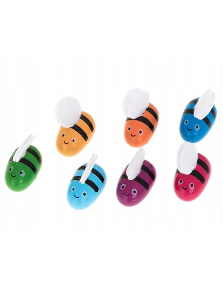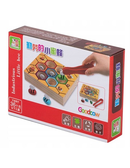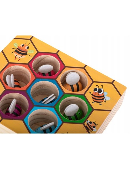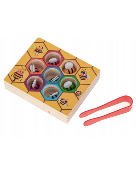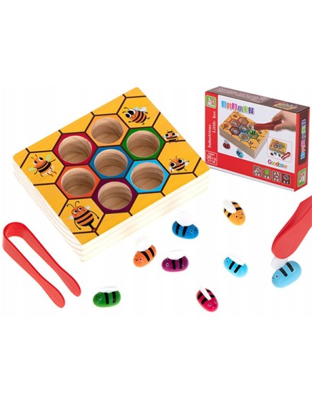 Vaiko užduotis – pridedamo pinceto pagalba ištraukti spalvotas bites, o po to kiekvieną įstatyti į spalvą atitinkančią skylutę.