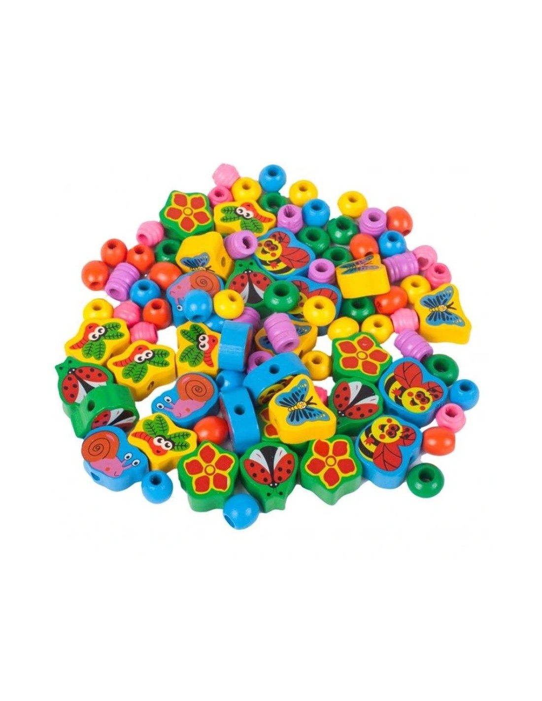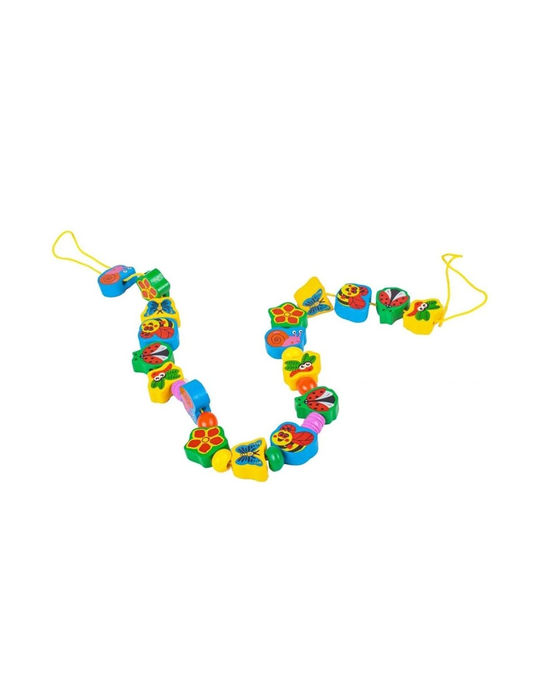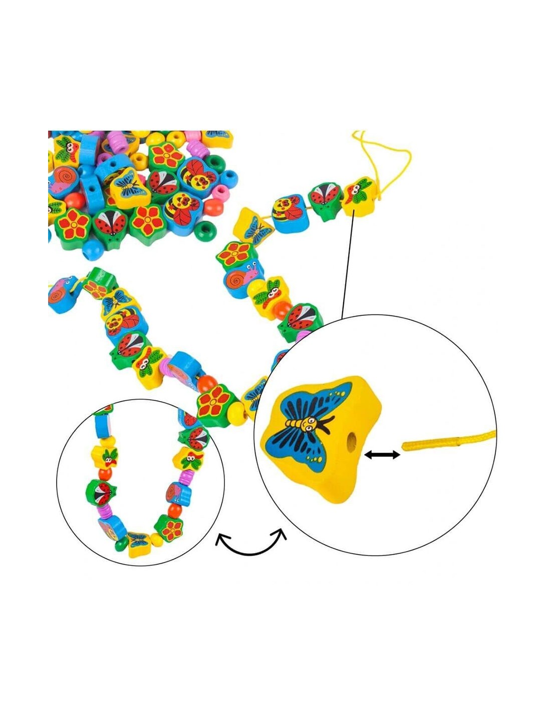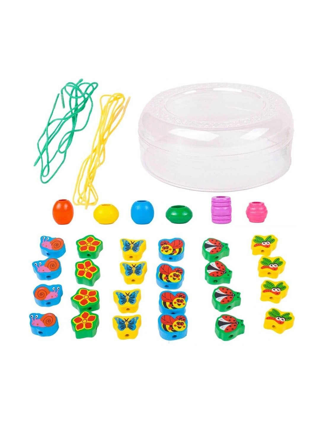 76 detalių medinis vėrimo rinkinis „Vabzdžiai“! Lavinkite vaiko motoriką kurdami spalvingus karolius. Rinkinyje 24 figūrėlių, 50 karoliukų ir 2 virvelės.