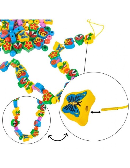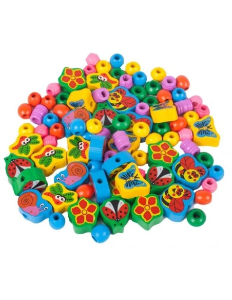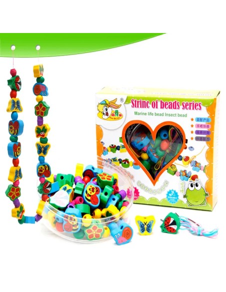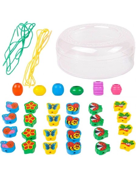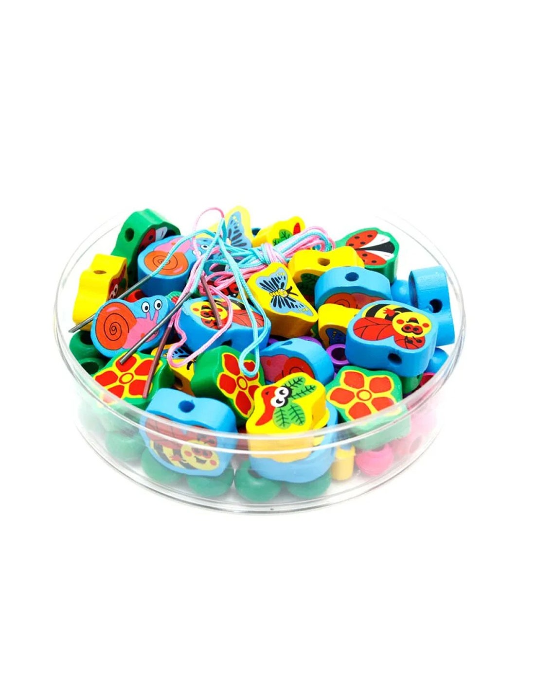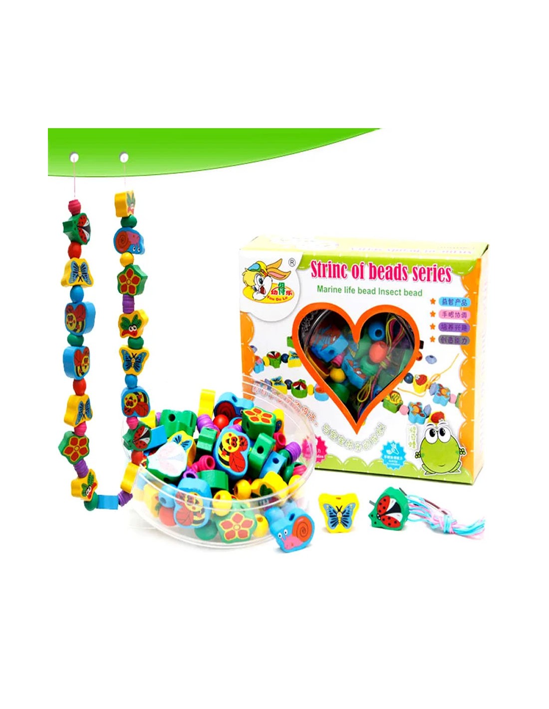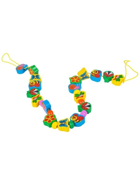 76 detalių medinis vėrimo rinkinis „Vabzdžiai“! Lavinkite vaiko motoriką kurdami spalvingus karolius. Rinkinyje 24 figūrėlių, 50 karoliukų ir 2 virvelės.