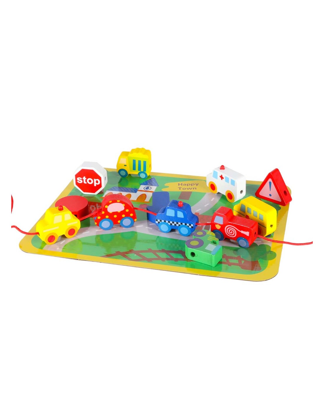„Du viename“ žaidimas: Vaikas gali ne tik verti detales ant virvelės, bet ir vairuoti automobilius ant pridedamos lentos-miestelio, taip lavindamas vaizduotę.