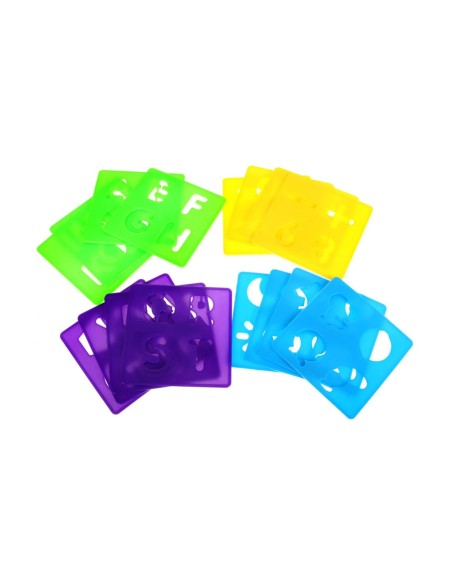 Plastikiniai perdengimai su piešimo šablonais (raidės, skaičiai, paveikslėliai, formos) x 16