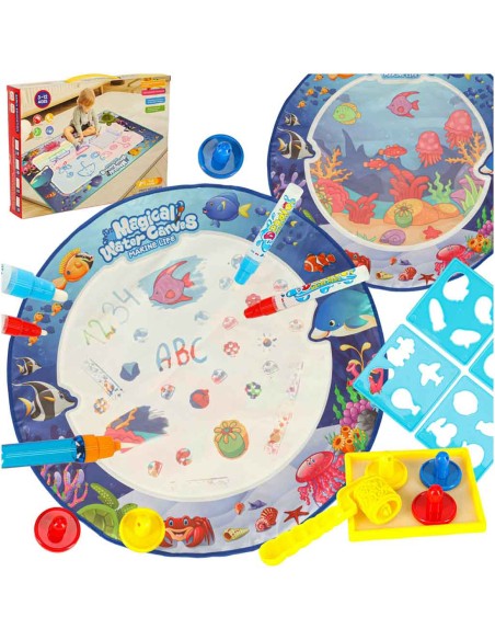 Magiškas 80 cm vandens piešimo kilimėlis! Kūryba be netvarkos: pieškite tik vandeniu. Su antspaudais, trafaretais ir 4 rašikliais. Saugu vaikams nuo 3 metų.
