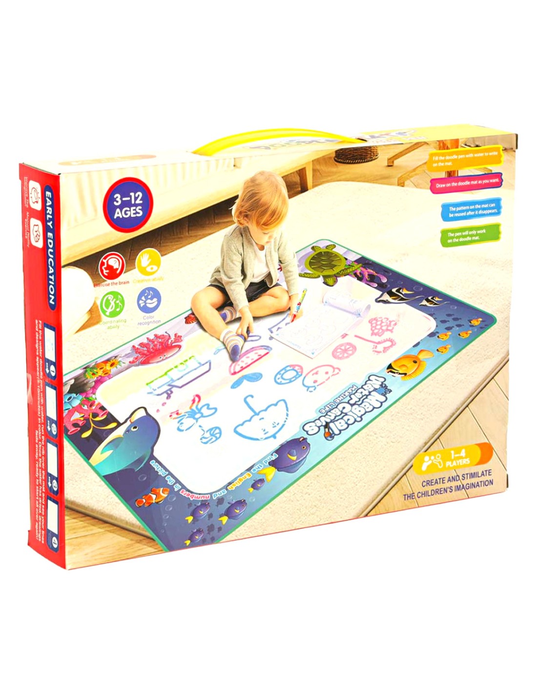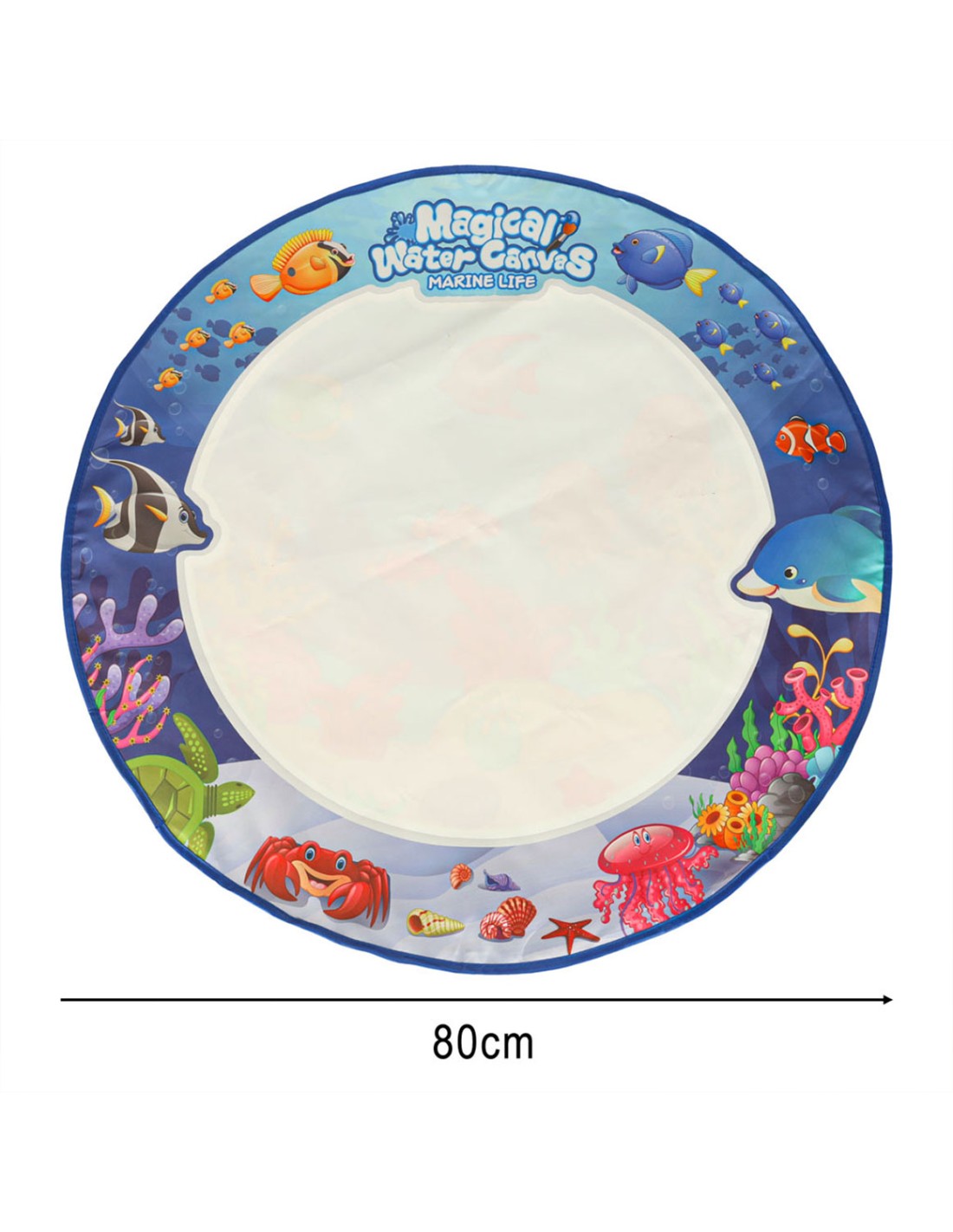 Pamirškite išteptus drabužius, dėmėtas sienas ir netvarkingus dažus! Šis unikalus 80 cm skersmens apvalus kilimėlis paverčia paprastą vandenį spalvinga drobe. Tai gryna magija: vaikas piešia švariu vandeniu, o piešiniui išdžiūvus – kilimėlis vėl tampa tuščias ir paruoštas naujiems šedevrams!